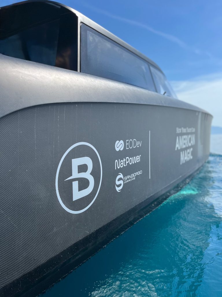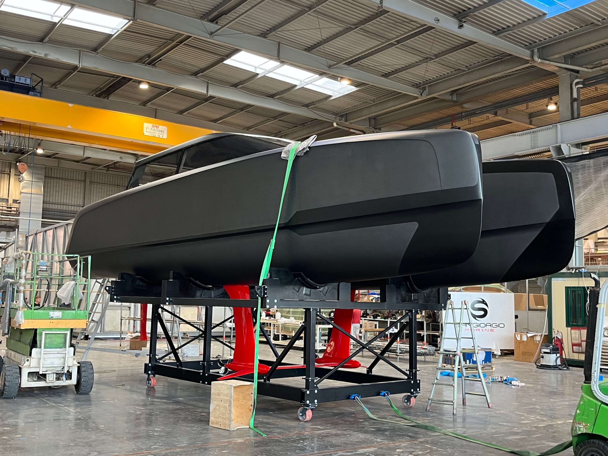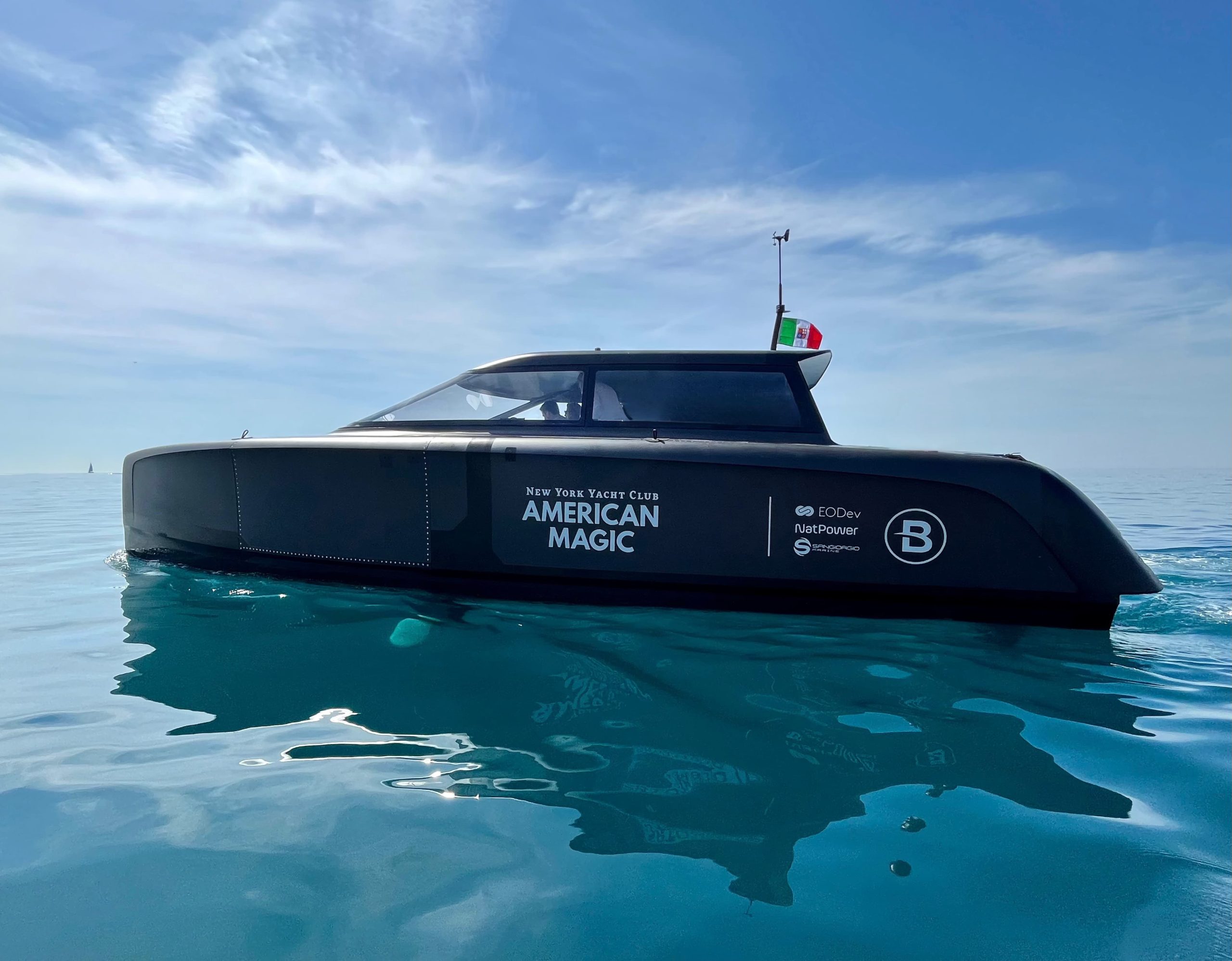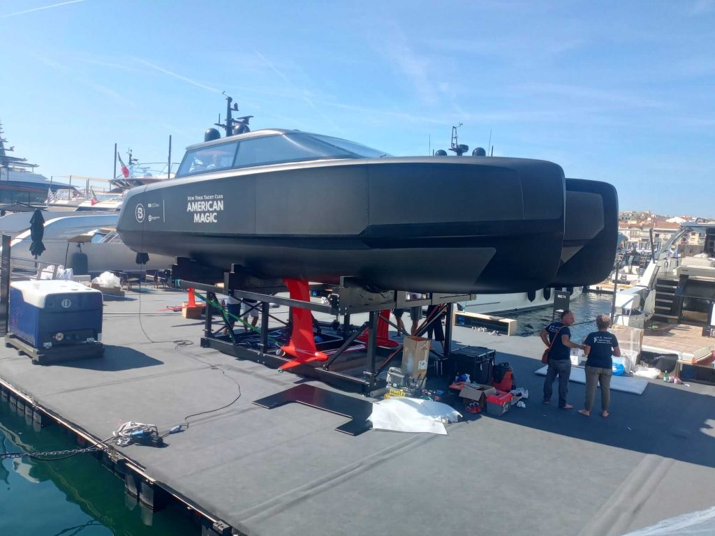 An innovative and high-tech BlueGame design created at SANGIORGIO MARINE shipyards for the 2024 edition of the America’s Cup. Support boat for the American Magic team was first built with carbonlook and matte black finishes to take part in the Monte Carlo and Genoa boat shows in fall 2023.