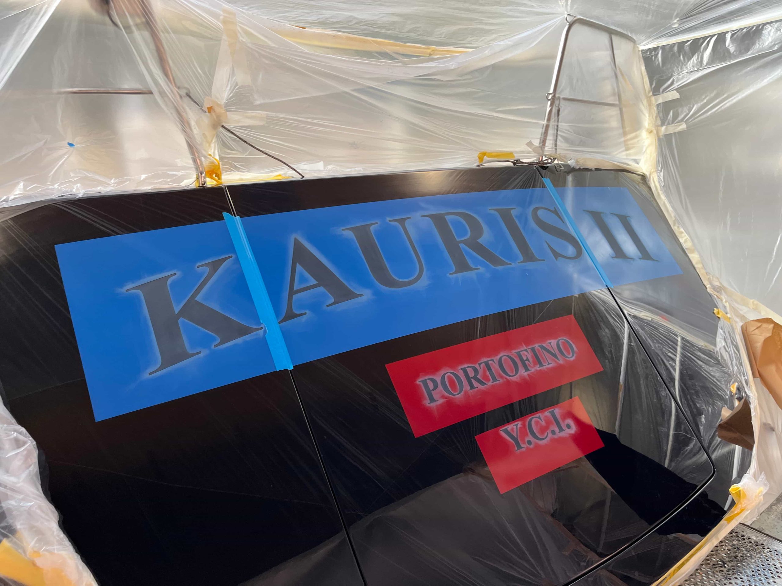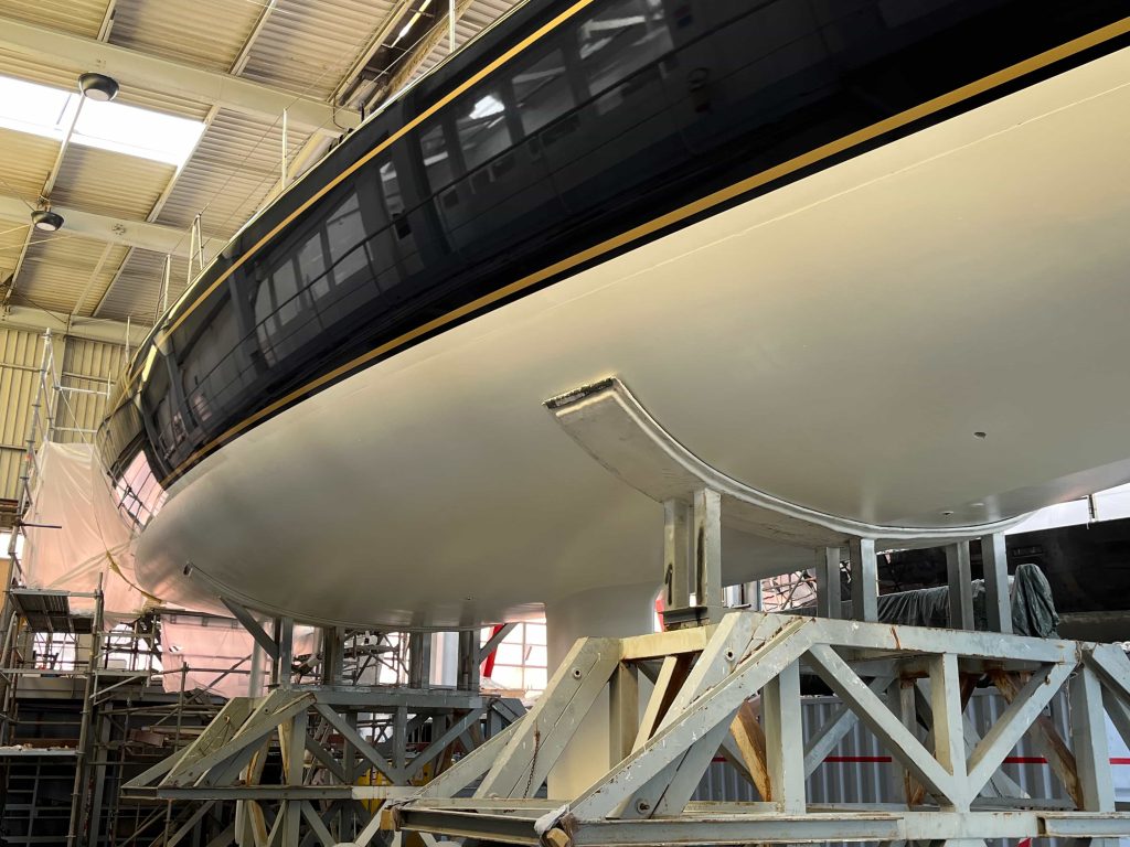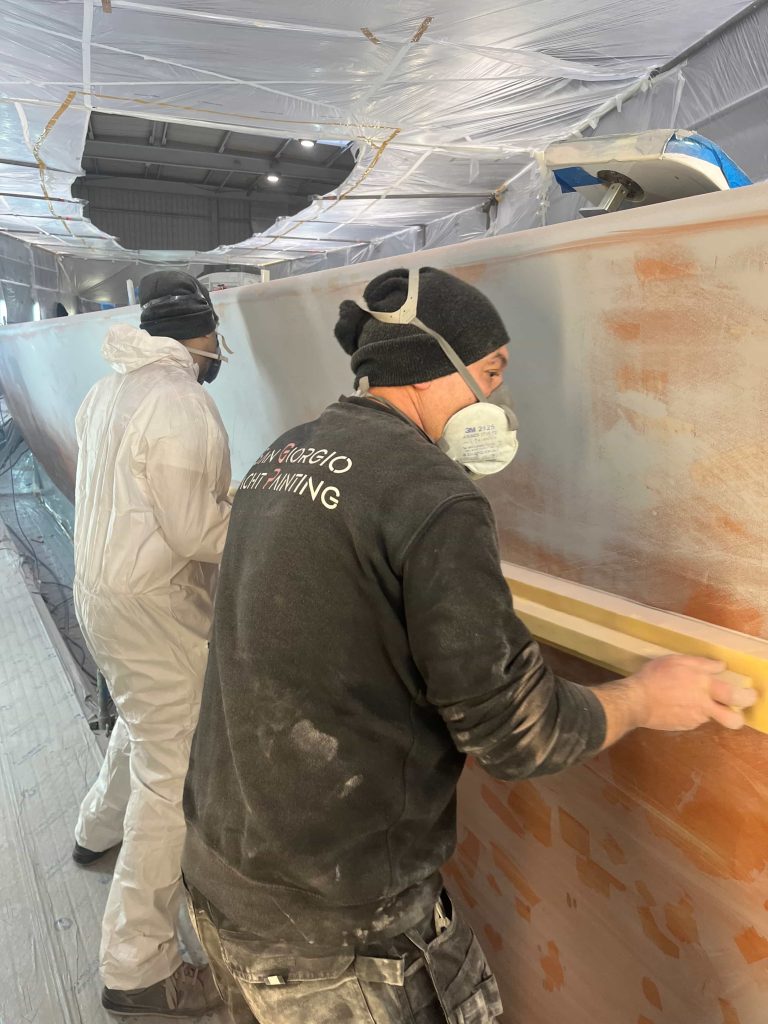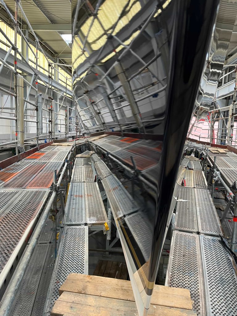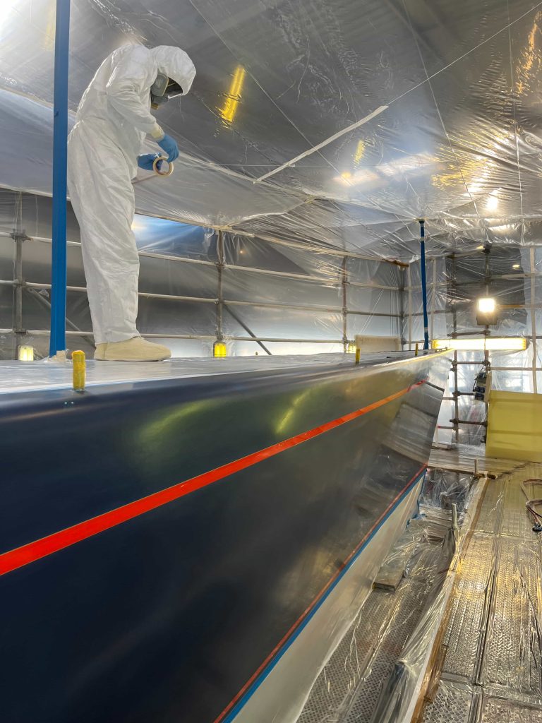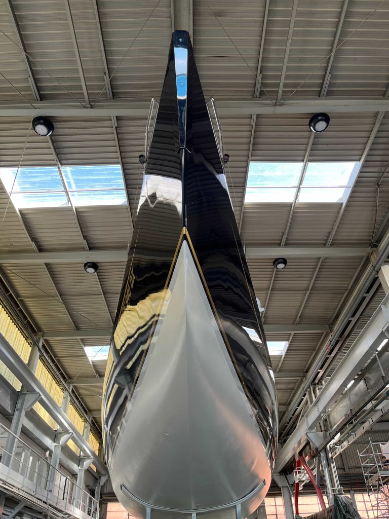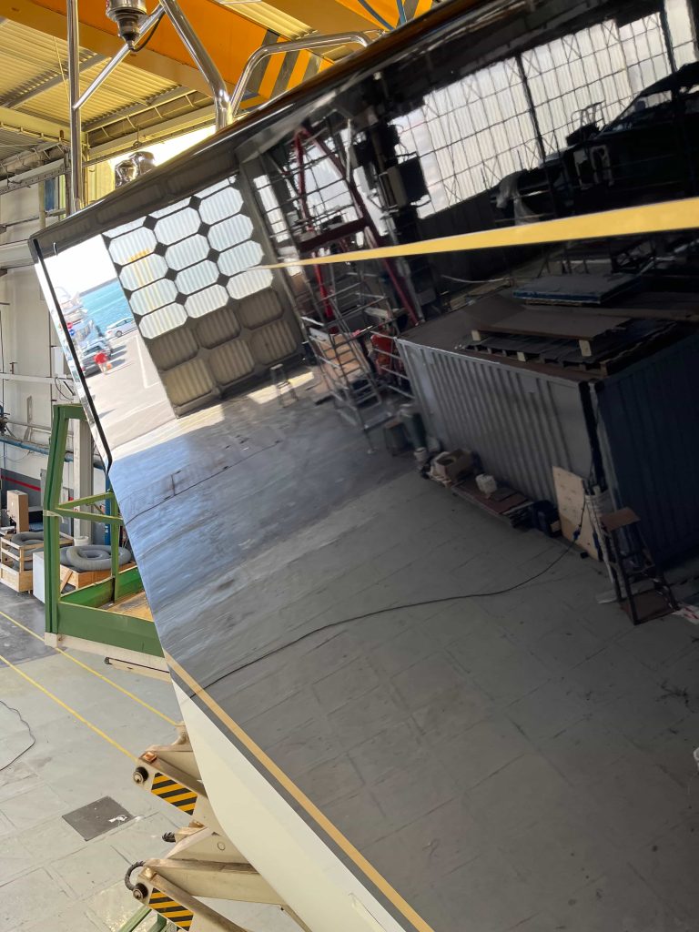 The Kauris II required a substantial refit of its topsides, particularly with some issues at the bow. It was necessary to completely remove all the filler and undertake a new surface preparation with the goal of minimizing the presence of filler and giving the bow a more streamlined appearance. On the entire topsides, we performed a complete removal of the paint layers, and the surfaces were treated using fairing during every sanding phase to ensure a perfectly smooth finish.