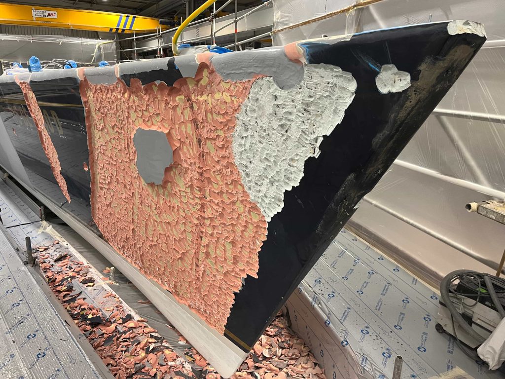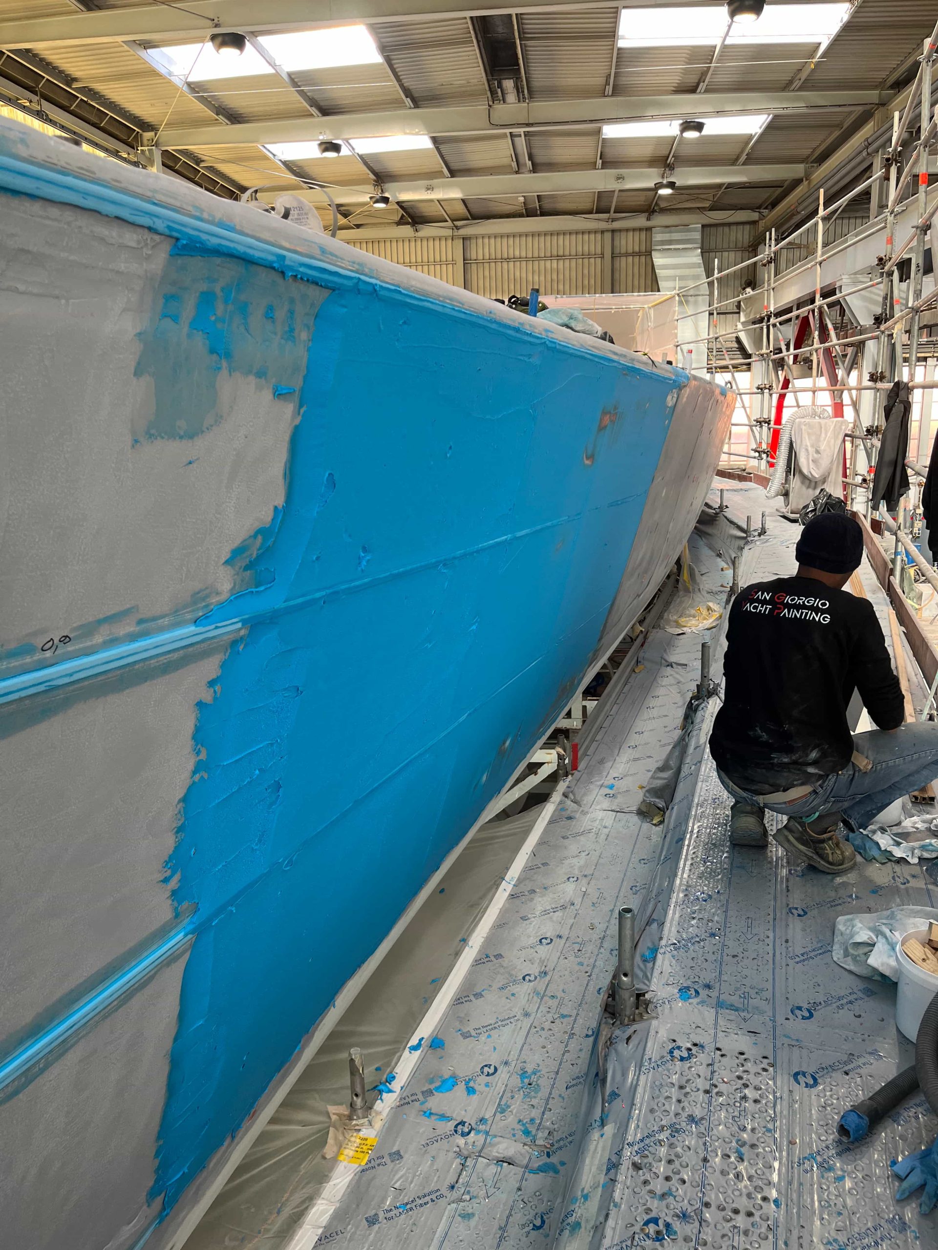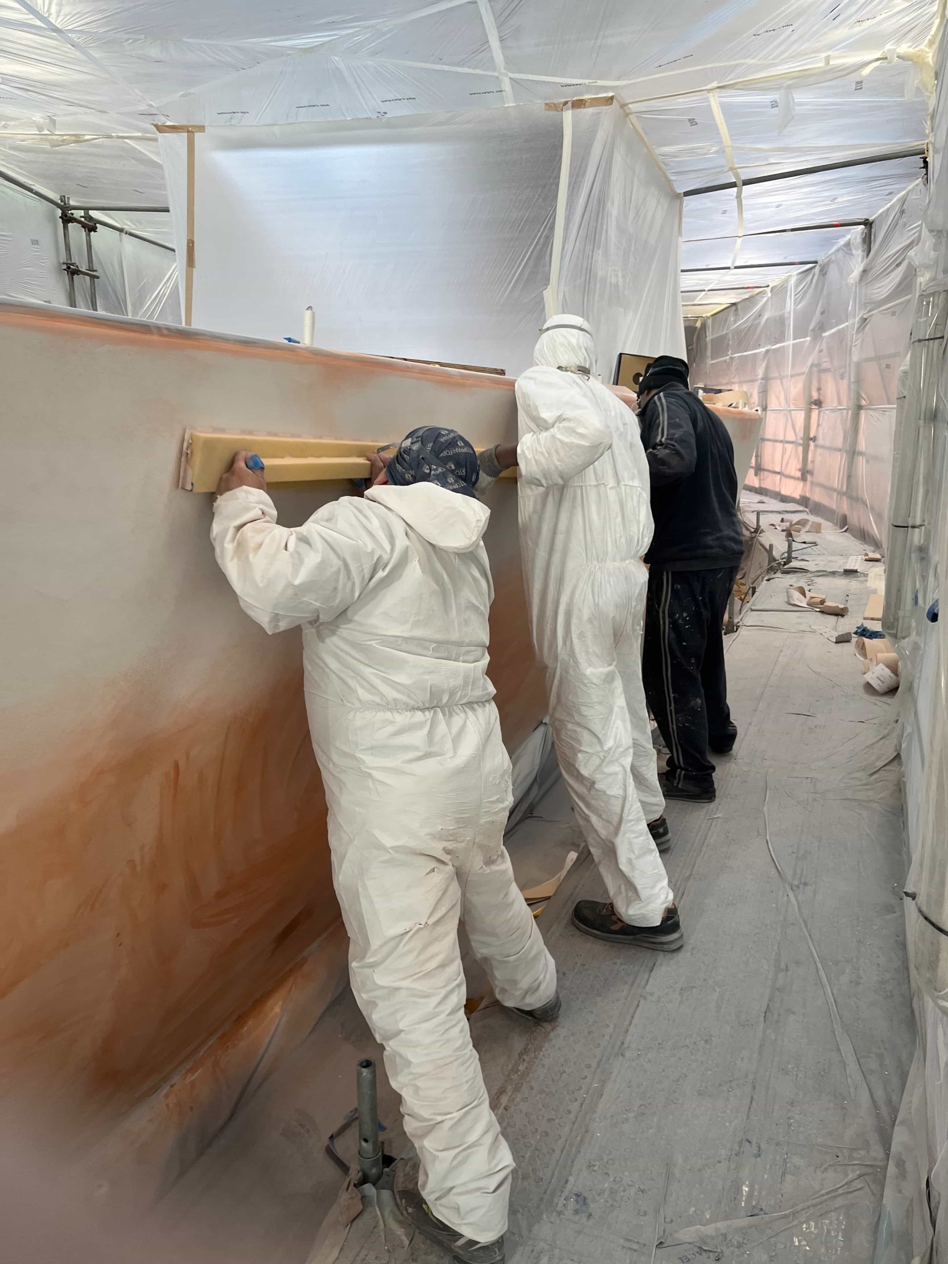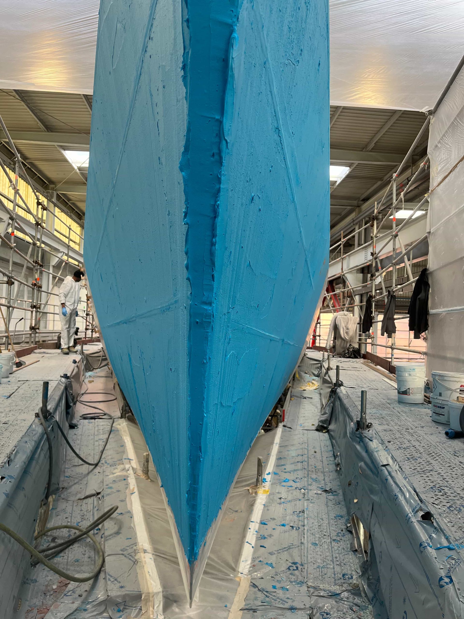 The Kauris II required a substantial refit of its topsides, particularly with some issues at the bow. It was necessary to completely remove all the filler and undertake a new surface preparation with the goal of minimizing the presence of filler and giving the bow a more streamlined appearance. On the entire topsides, we performed a complete removal of the paint layers, and the surfaces were treated using fairing during every sanding phase to ensure a perfectly smooth finish.
