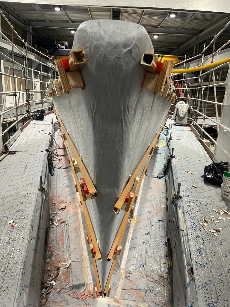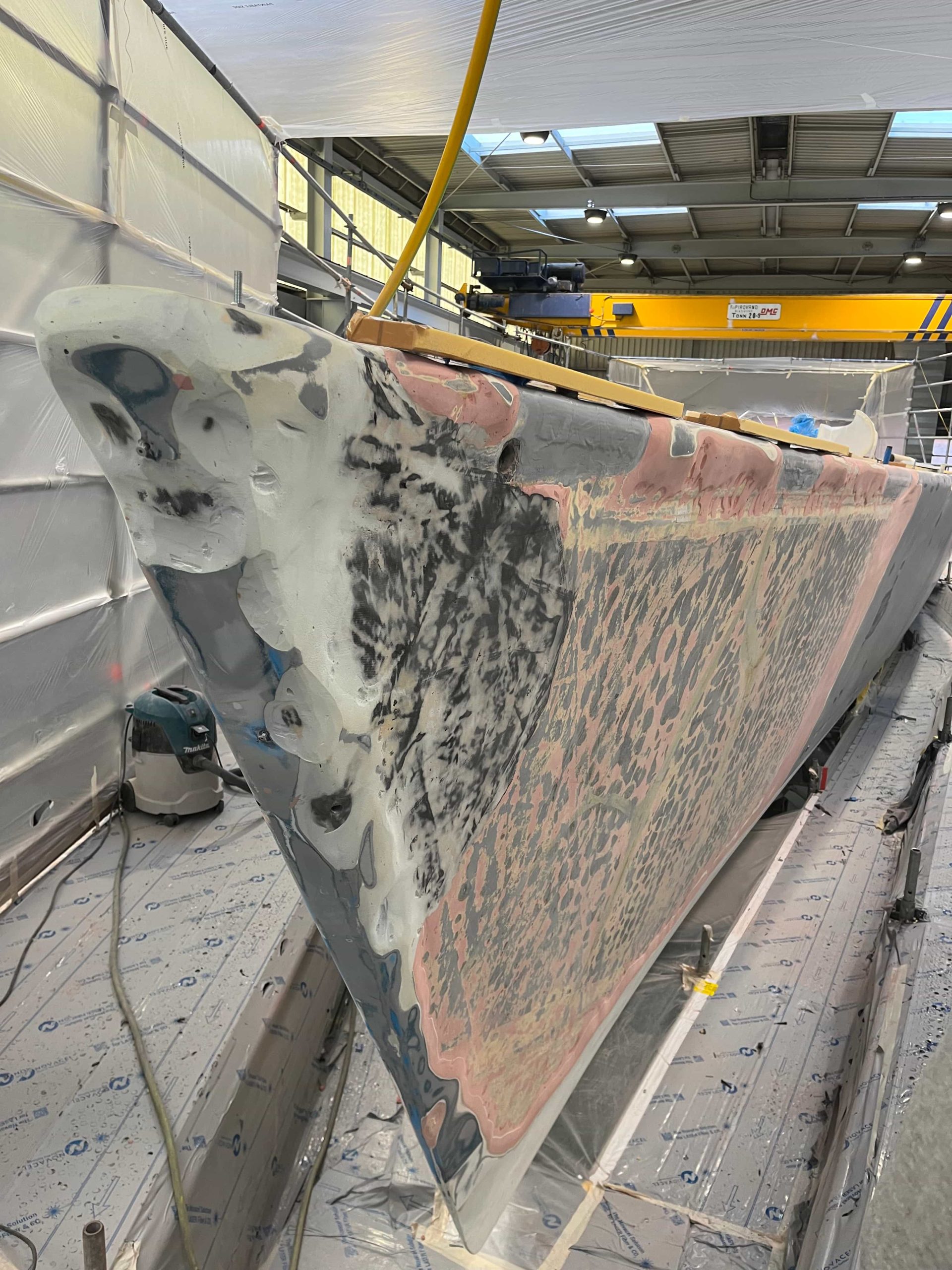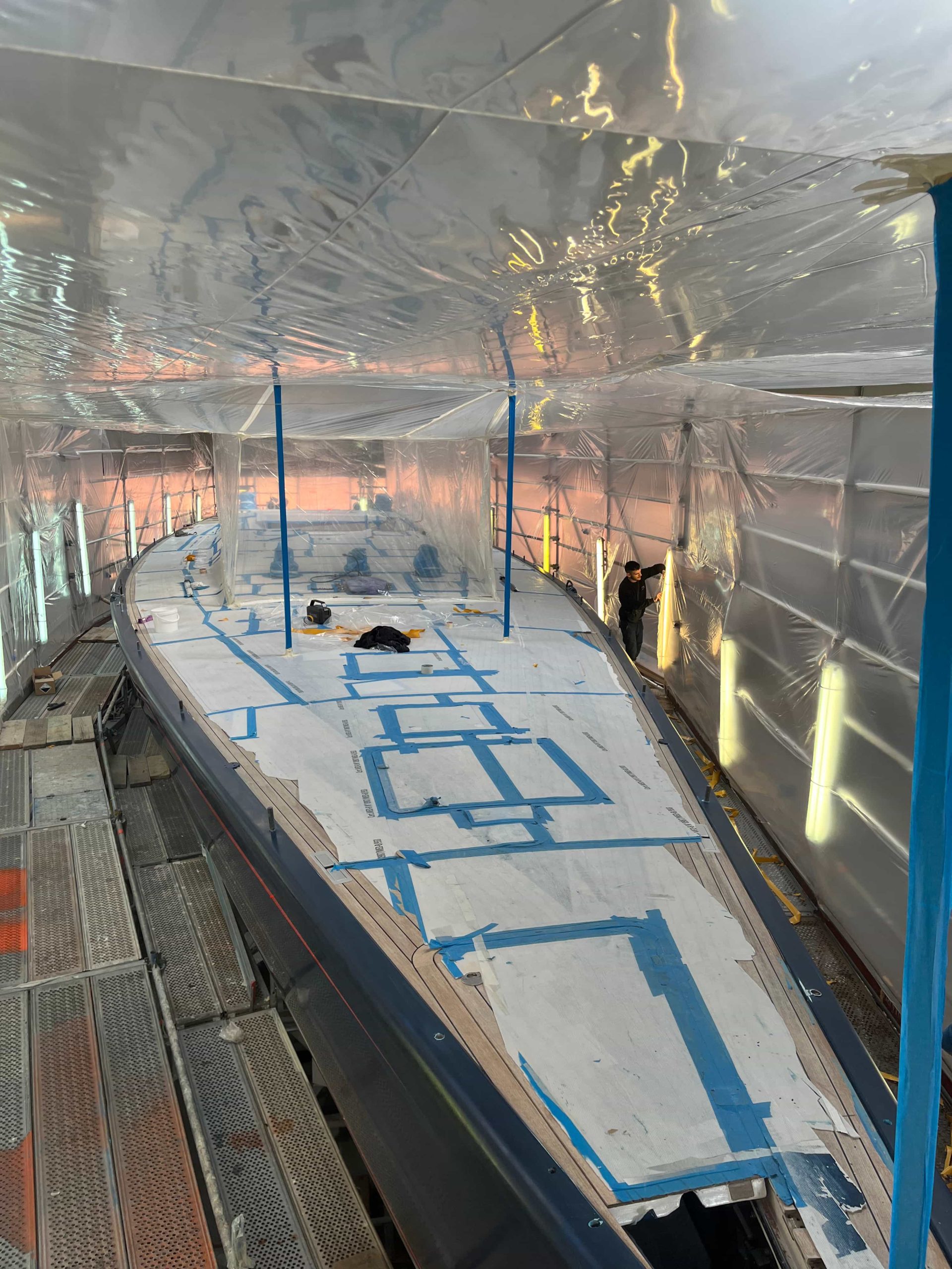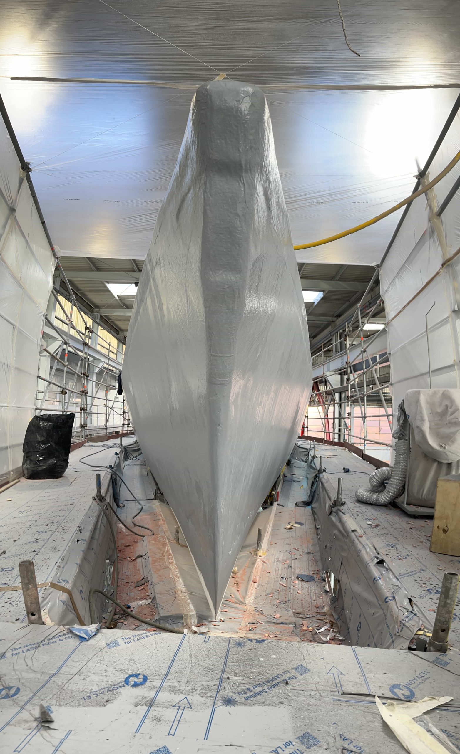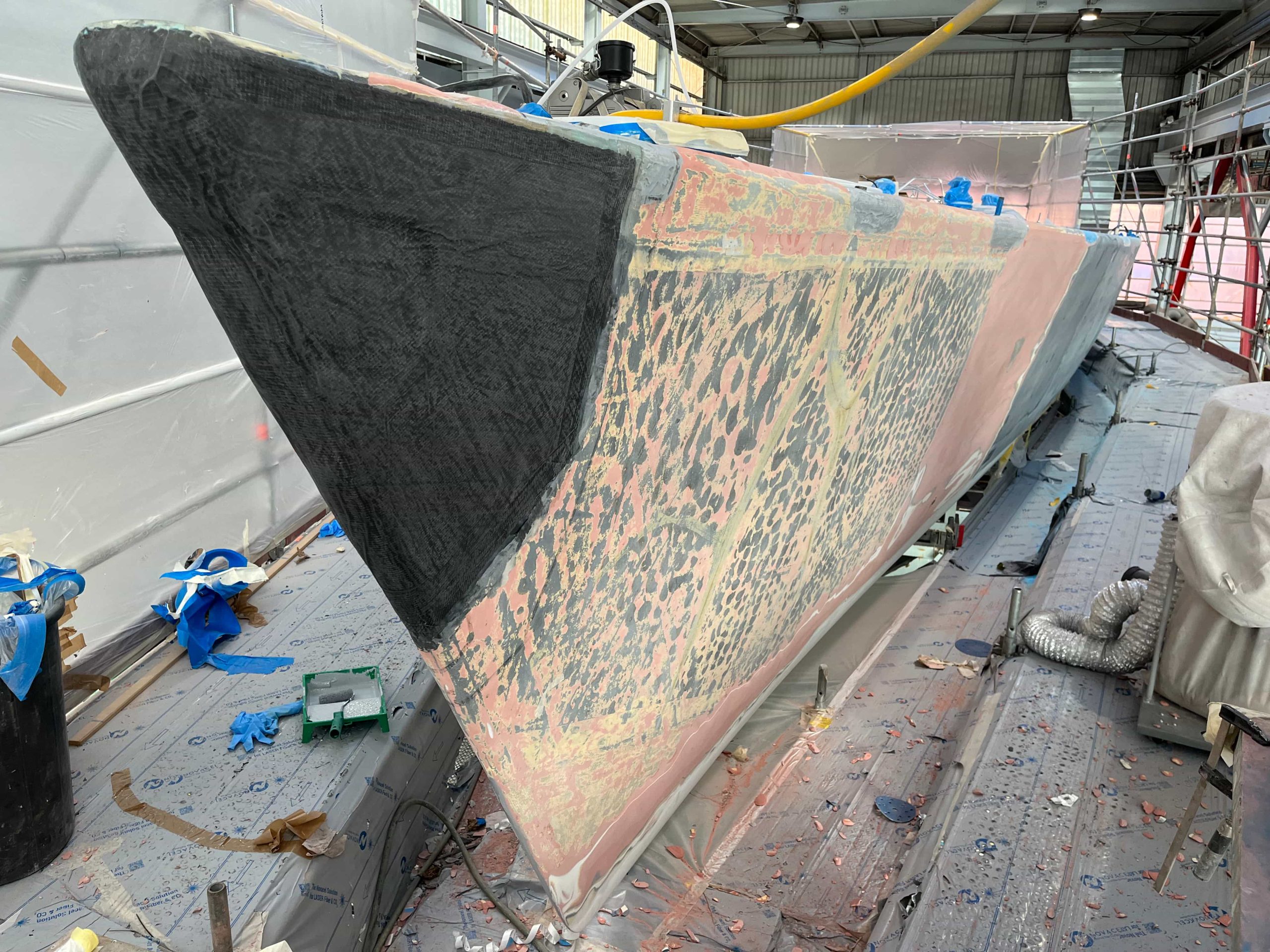 The Kauris II required a substantial refit of its topsides, particularly with some issues at the bow. It was necessary to completely remove all the filler and undertake a new surface preparation with the goal of minimizing the presence of filler and giving the bow a more streamlined appearance. On the entire topsides, we performed a complete removal of the paint layers, and the surfaces were treated using fairing during every sanding phase to ensure a perfectly smooth finish.