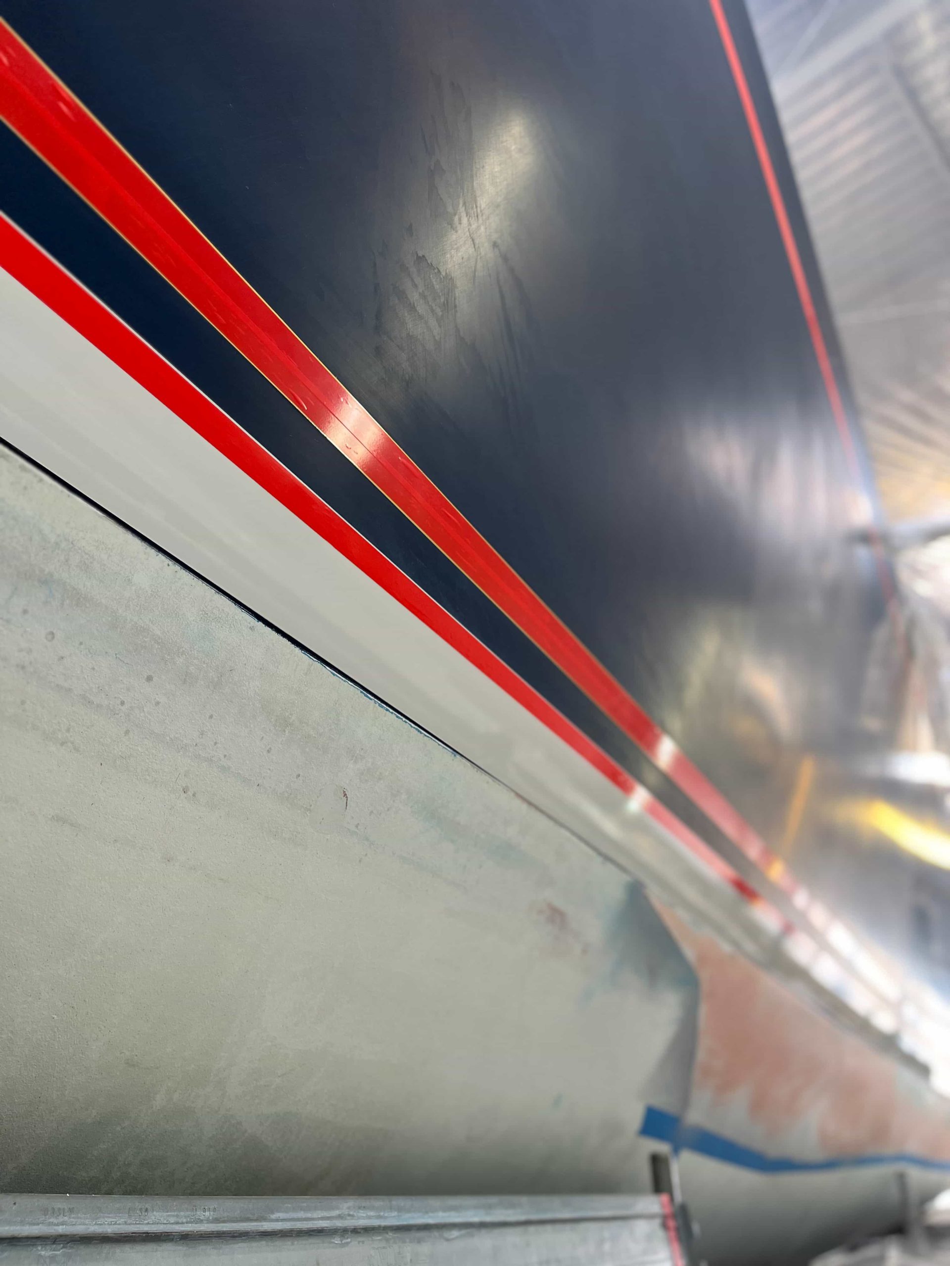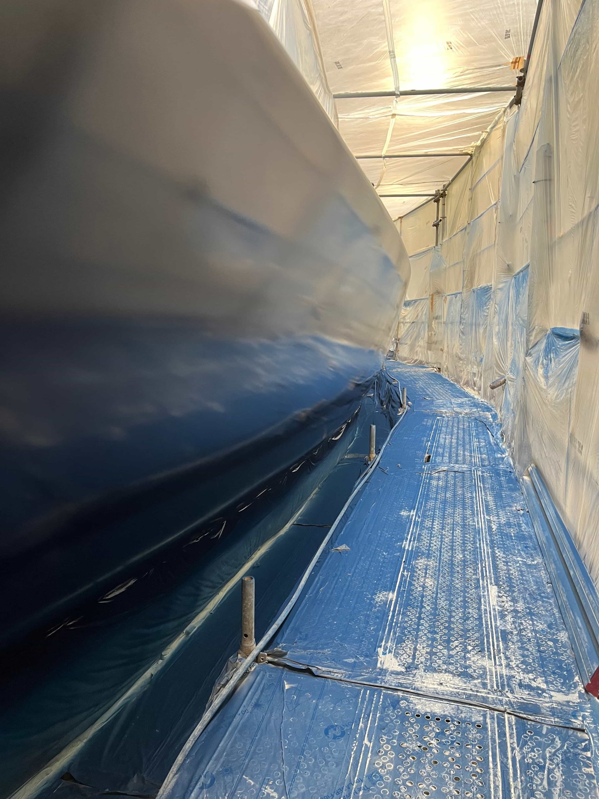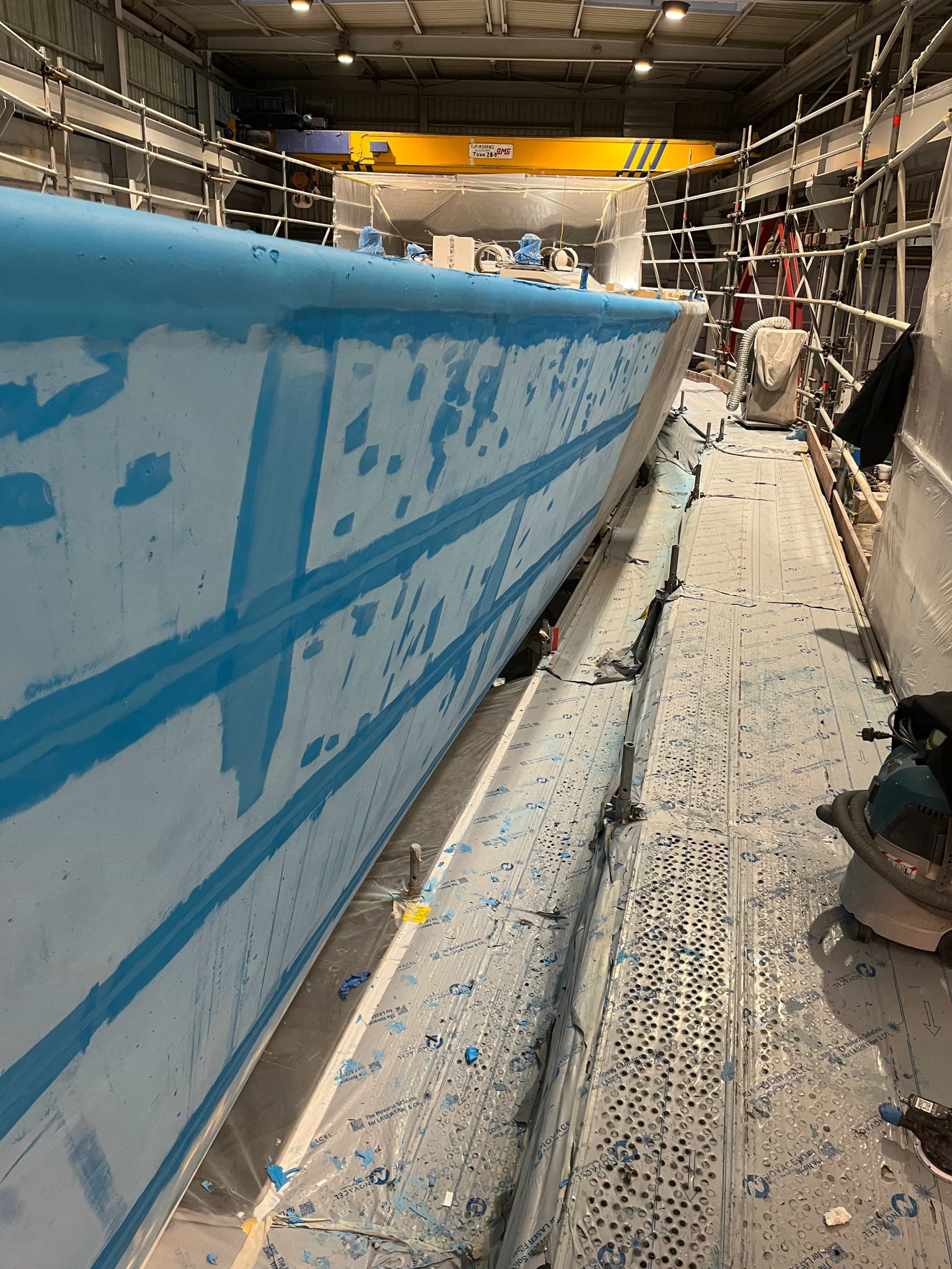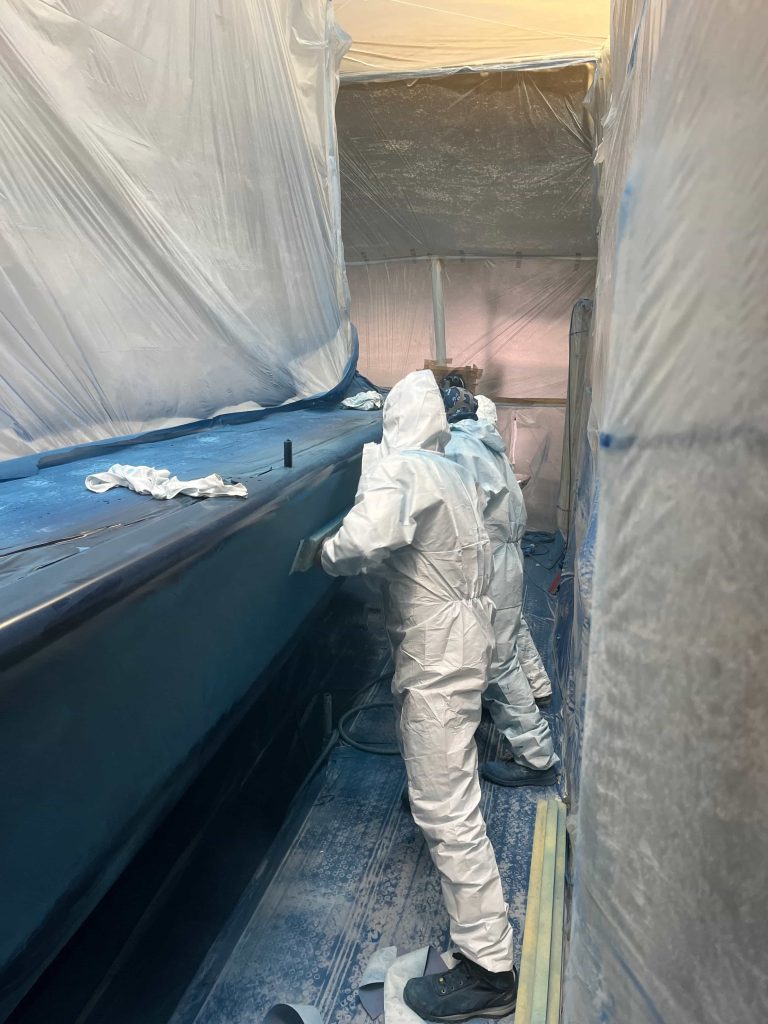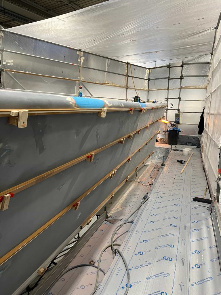 The Kauris II required a substantial refit of its topsides, particularly with some issues at the bow. It was necessary to completely remove all the filler and undertake a new surface preparation with the goal of minimizing the presence of filler and giving the bow a more streamlined appearance. On the entire topsides, we performed a complete removal of the paint layers, and the surfaces were treated using fairing during every sanding phase to ensure a perfectly smooth finish.