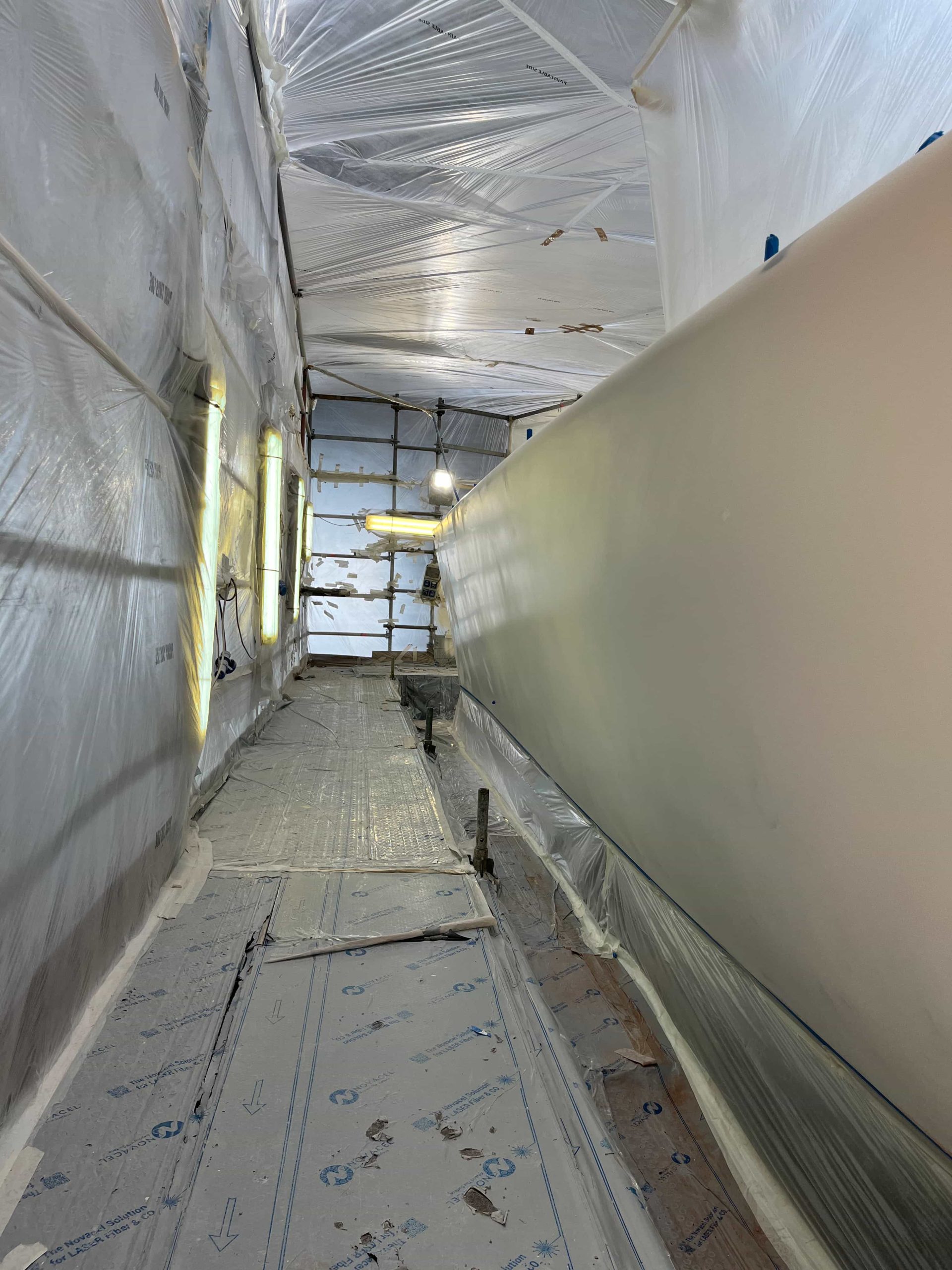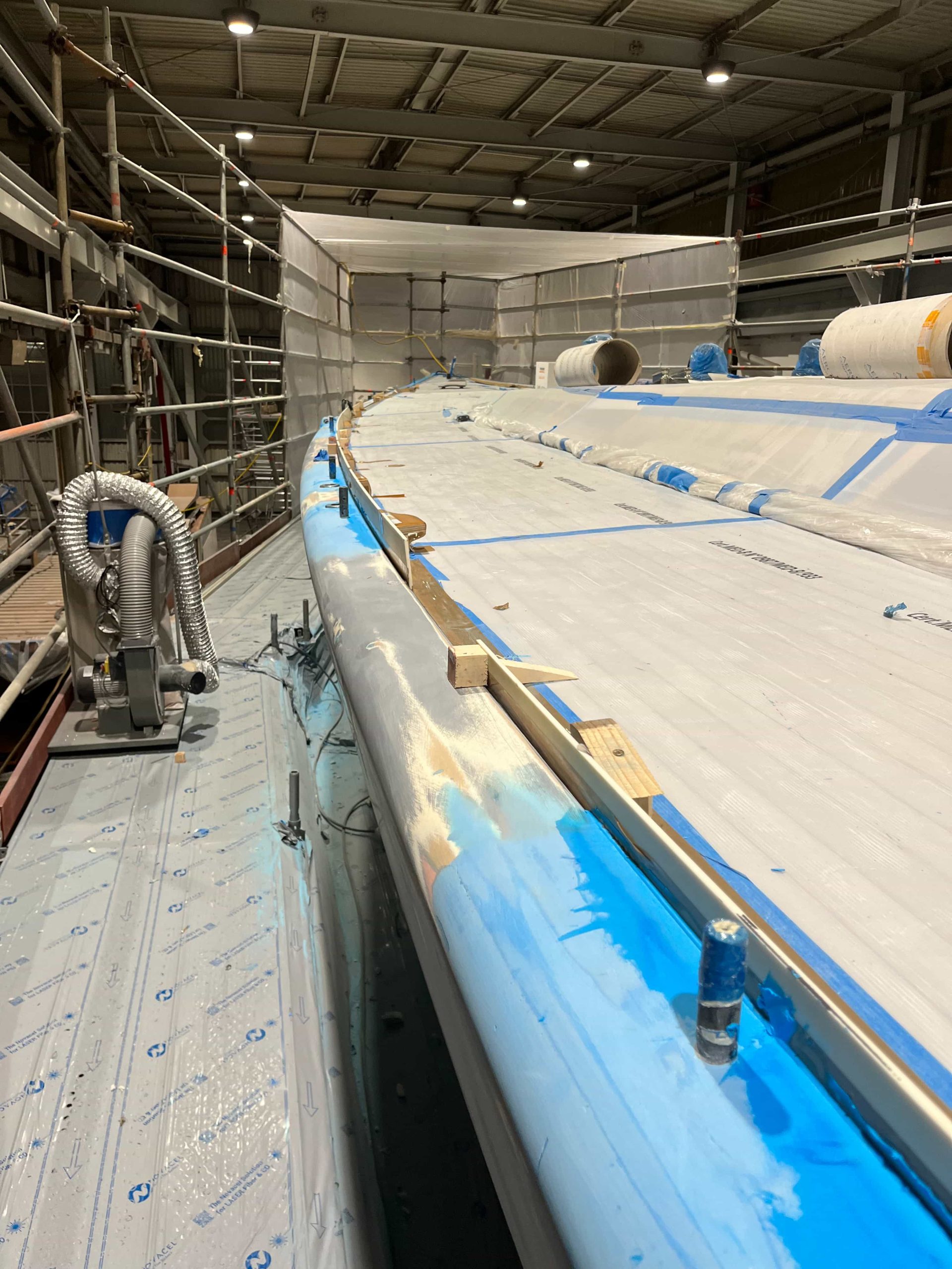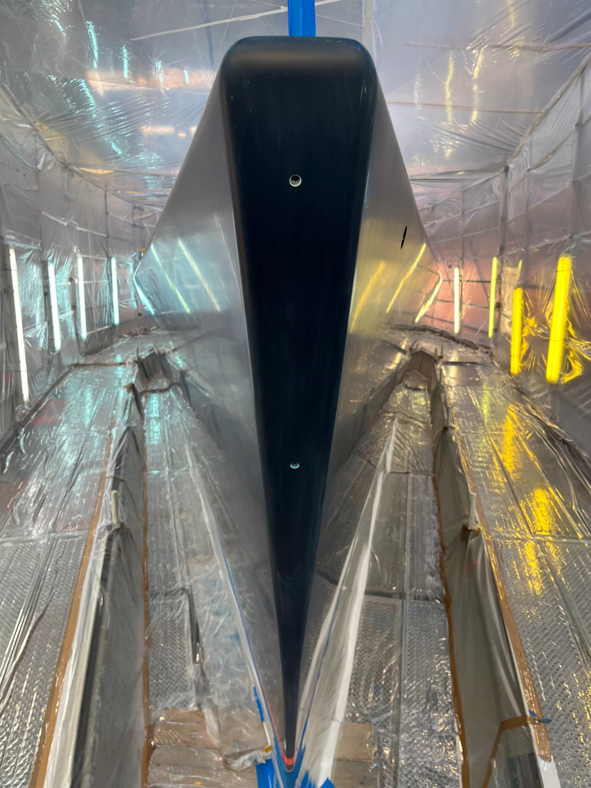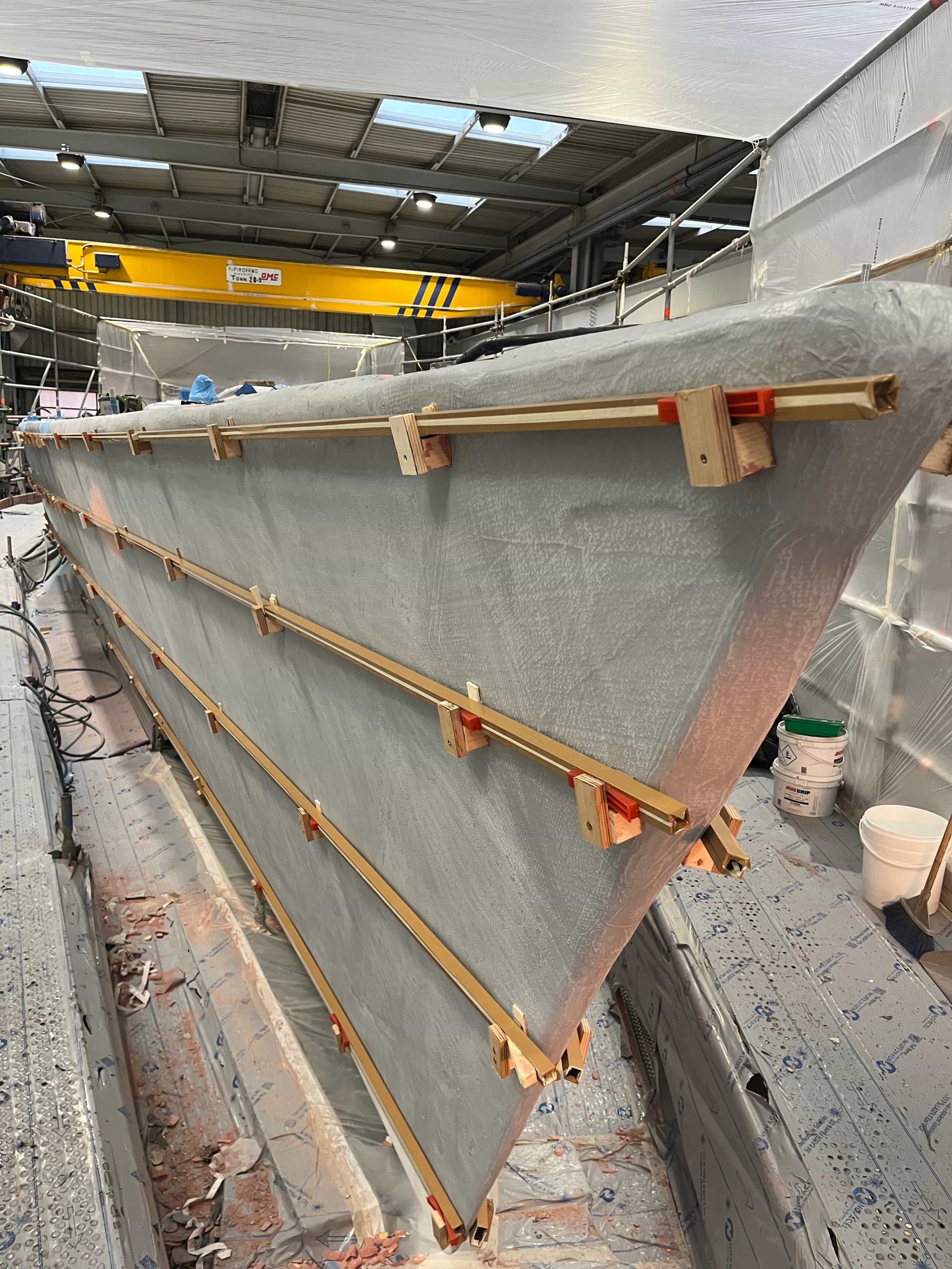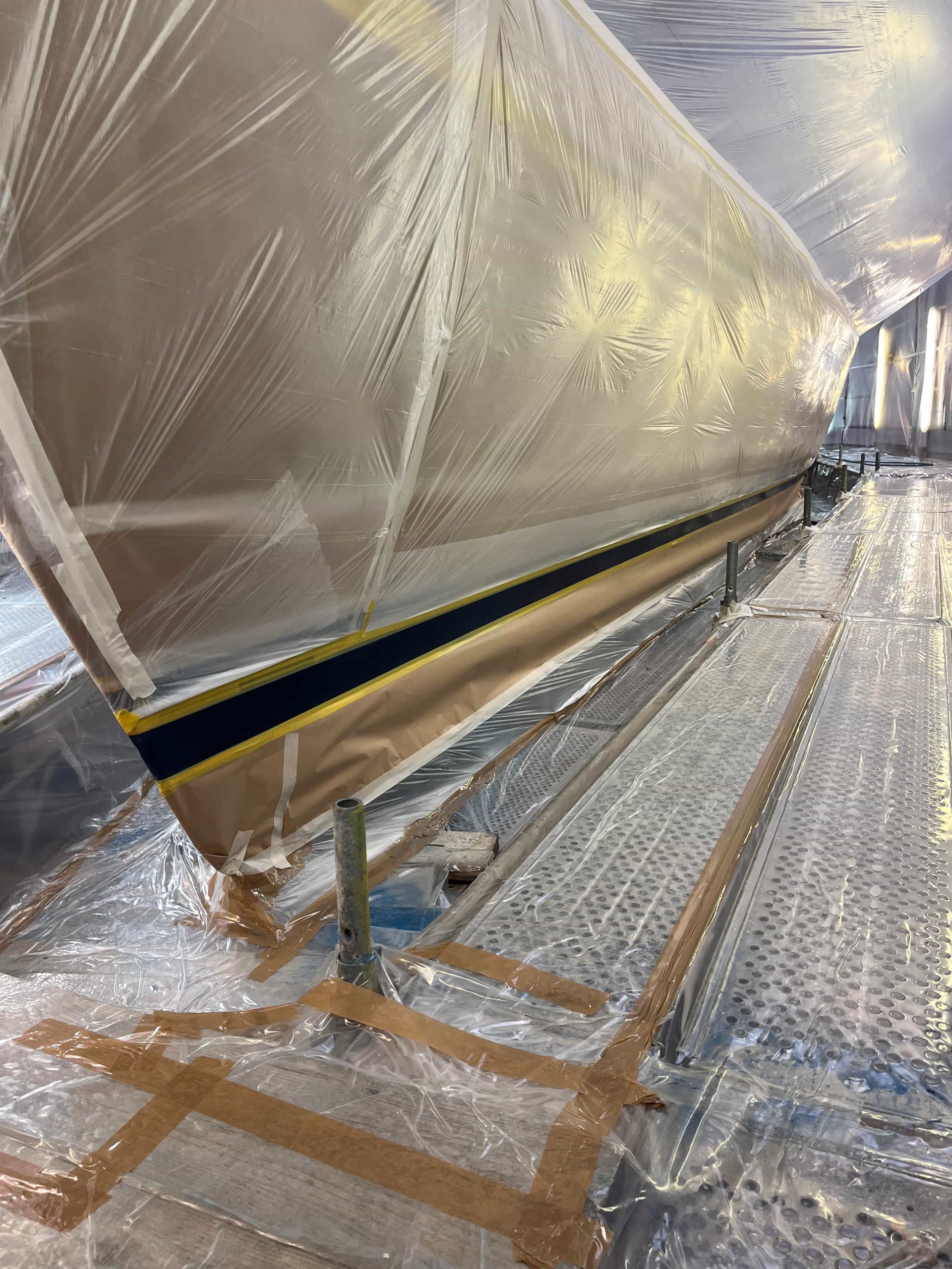 The Kauris II required a substantial refit of its topsides, particularly with some issues at the bow. It was necessary to completely remove all the filler and undertake a new surface preparation with the goal of minimizing the presence of filler and giving the bow a more streamlined appearance. On the entire topsides, we performed a complete removal of the paint layers, and the surfaces were treated using fairing during every sanding phase to ensure a perfectly smooth finish.