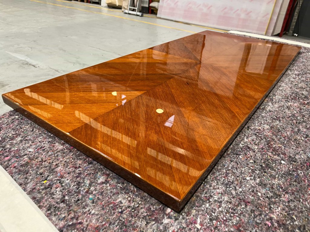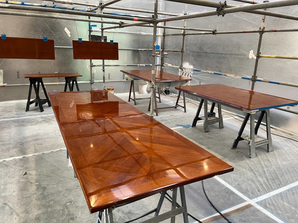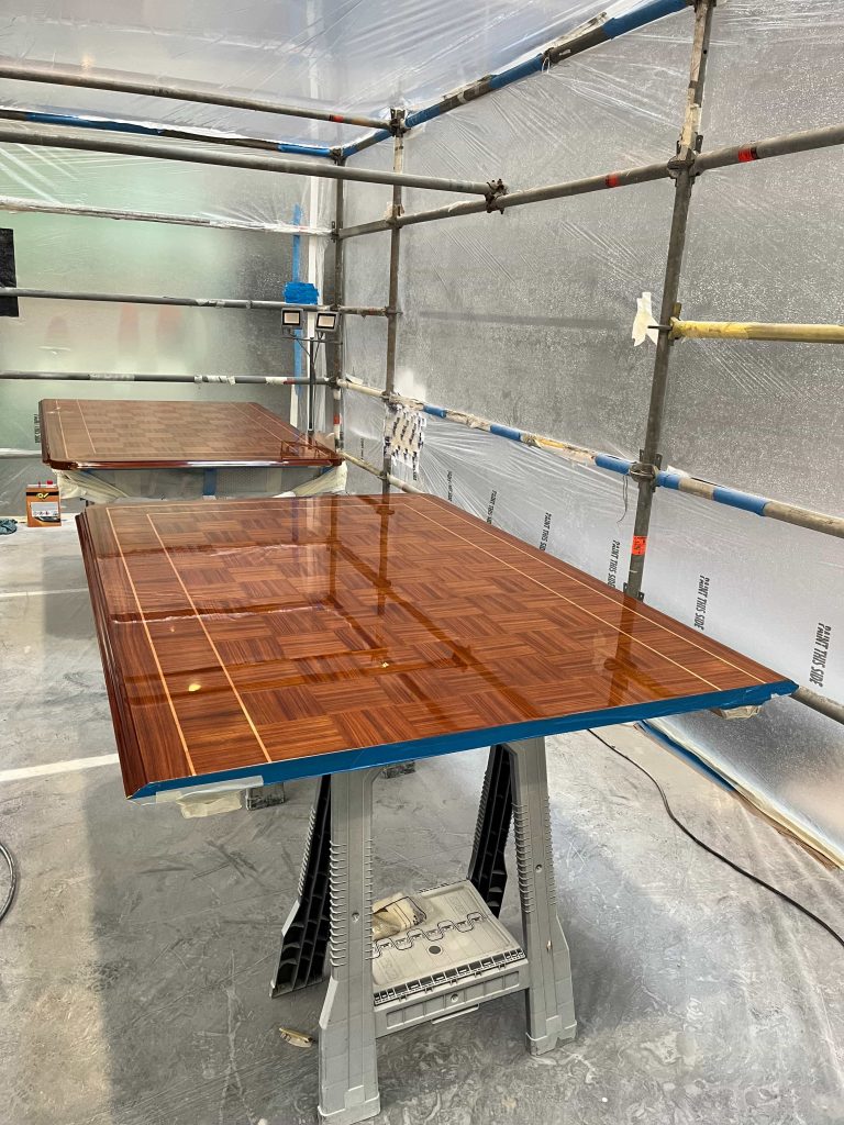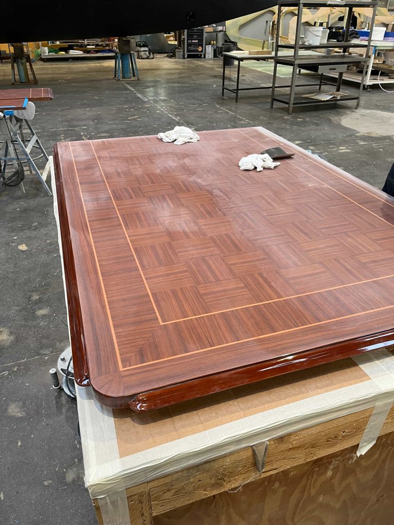 For this luxury yacht, built at the Mondo Marine shipyards, we were commissioned to handle the complete refinishing of all external and internal tables, which required restoration. After stripping them down to the bare wood and performing necessary restoration interventions, we proceeded with the painting and subsequent polishing, ensuring an aesthetically flawless result.
