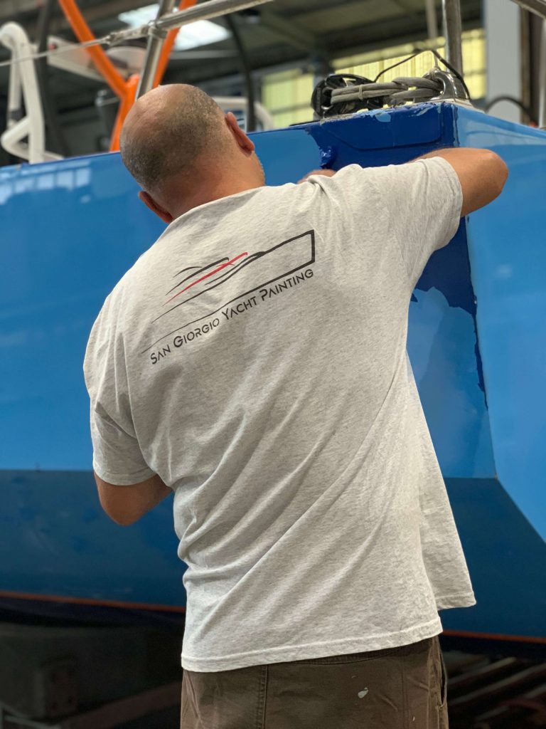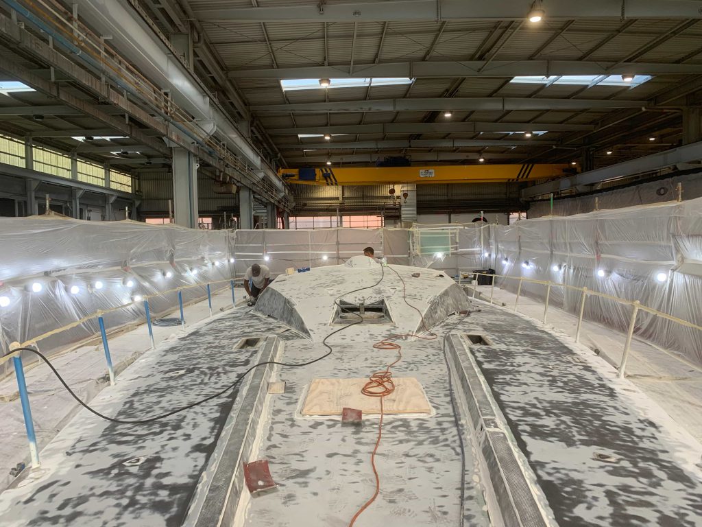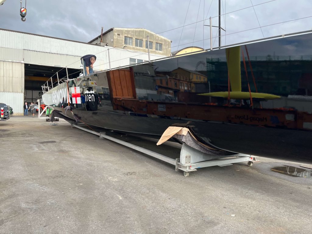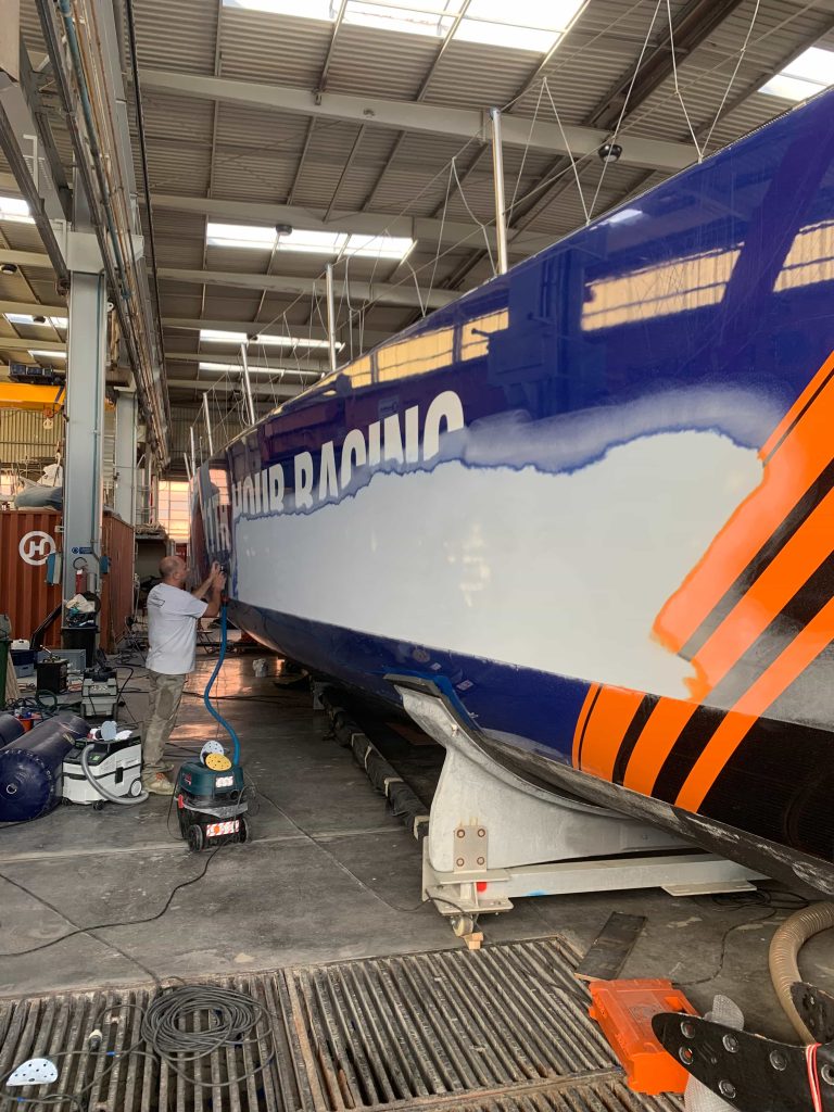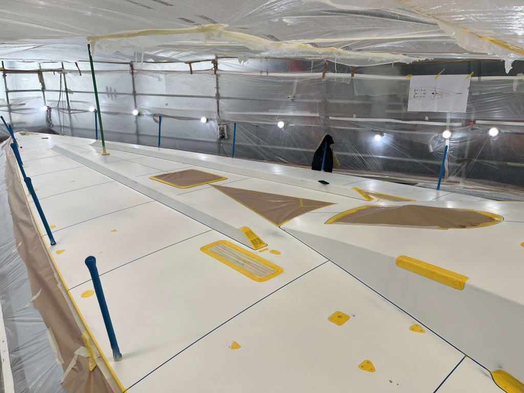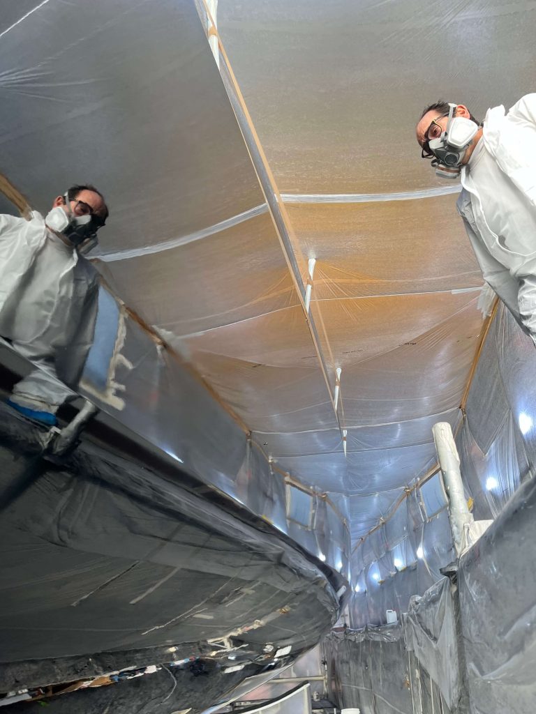 A massive refit for a VOLVO 65 racing boat, started in September 2022 at the SANGIORGIO MARINE shipyards. After removing the old films and graphics, a thorough restoration of the entire vessel was carried out, stripping it down to bare carbon before reapplying the entire AwlGrip painting cycle with matte base and lacquer finishes. A long and meticulous refit aimed at reducing the weight of the materials used without sacrificing the aesthetic aspect.
