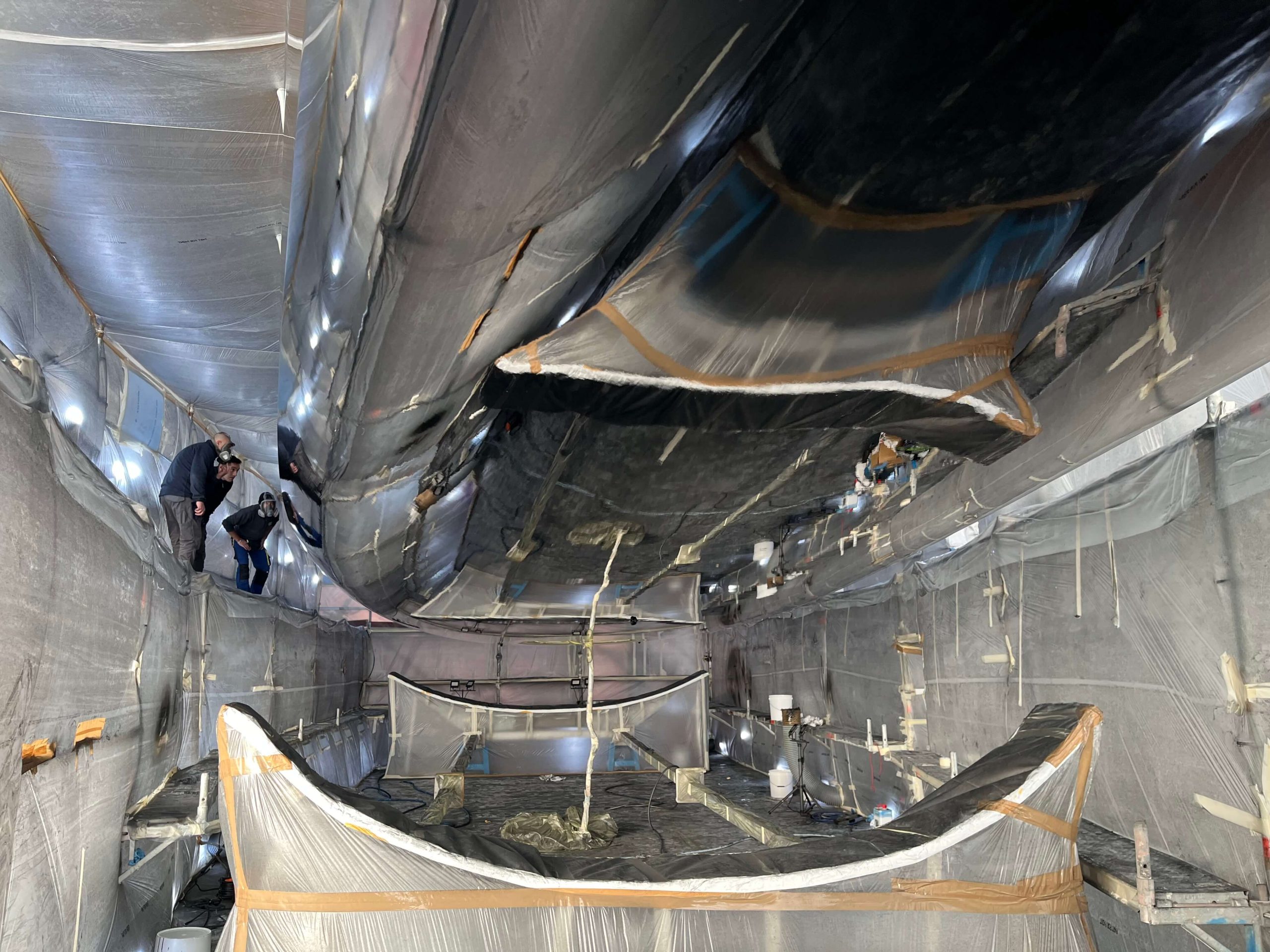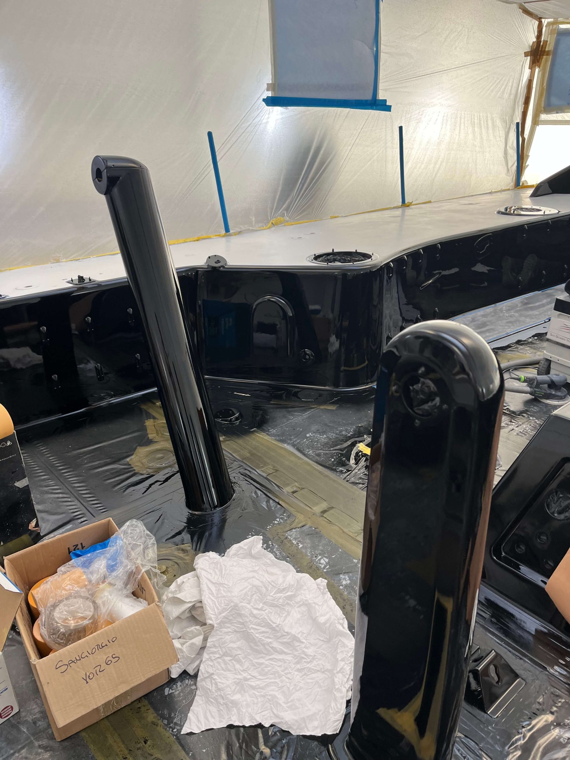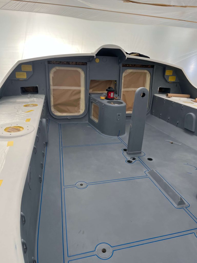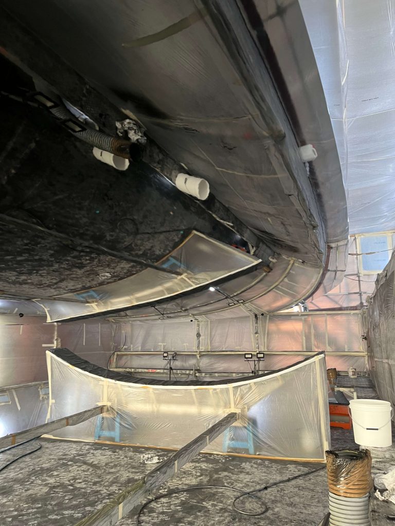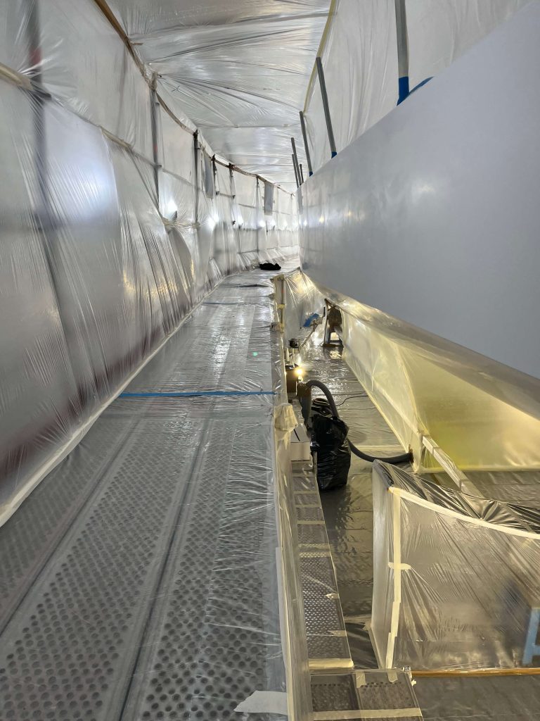A massive refit for a VOLVO 65 racing boat, started in September 2022 at the SANGIORGIO MARINE shipyards. After removing the old films and graphics, a thorough restoration of the entire vessel was carried out, stripping it down to bare carbon before reapplying the entire AwlGrip painting cycle with matte base and lacquer finishes. A long and meticulous refit aimed at reducing the weight of the materials used without sacrificing the aesthetic aspect.