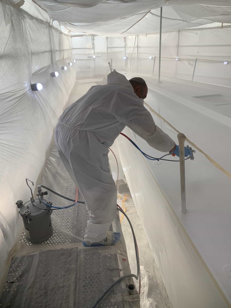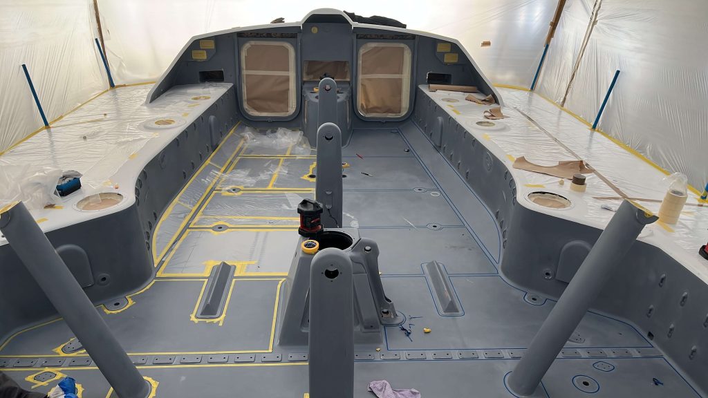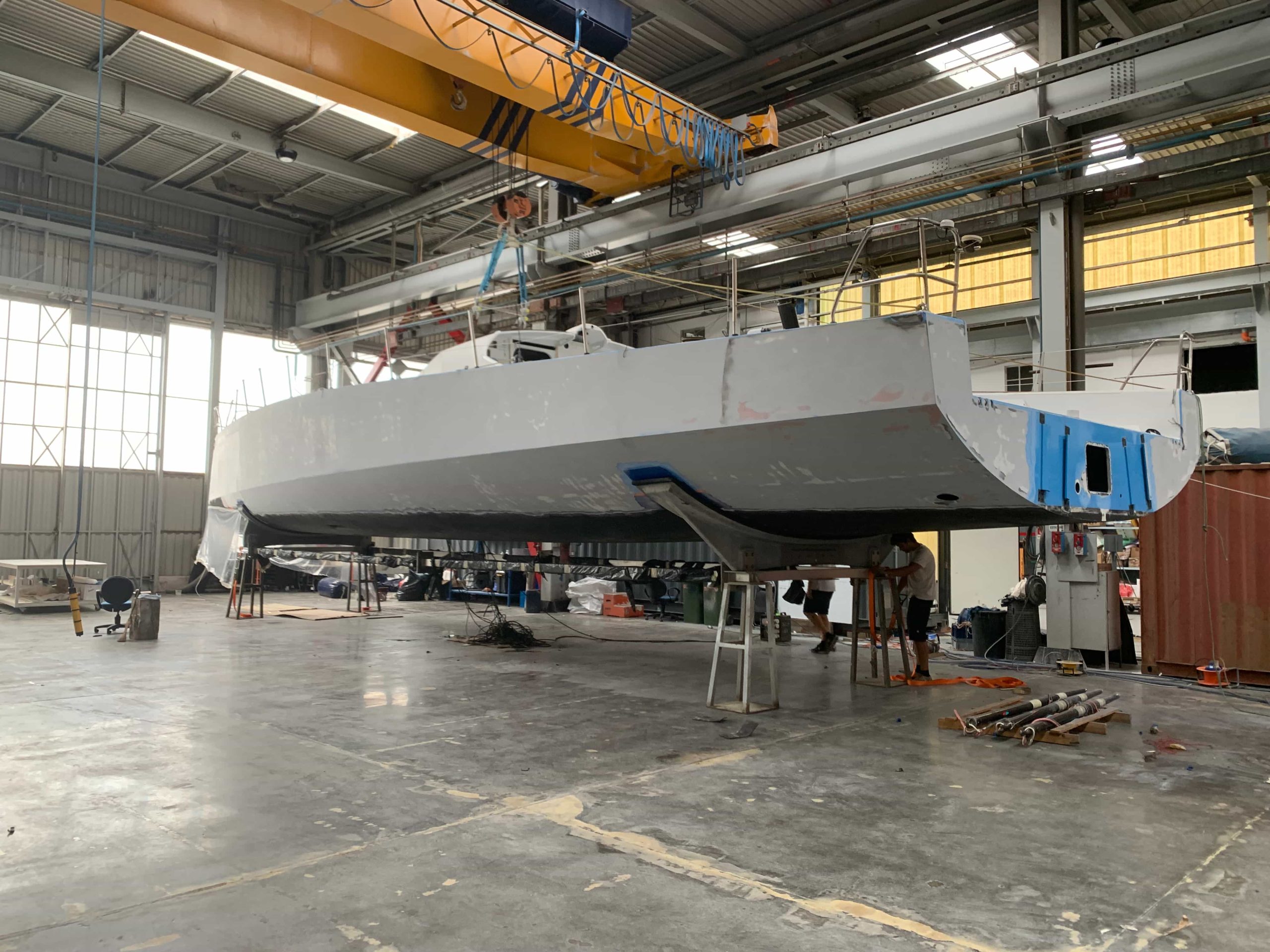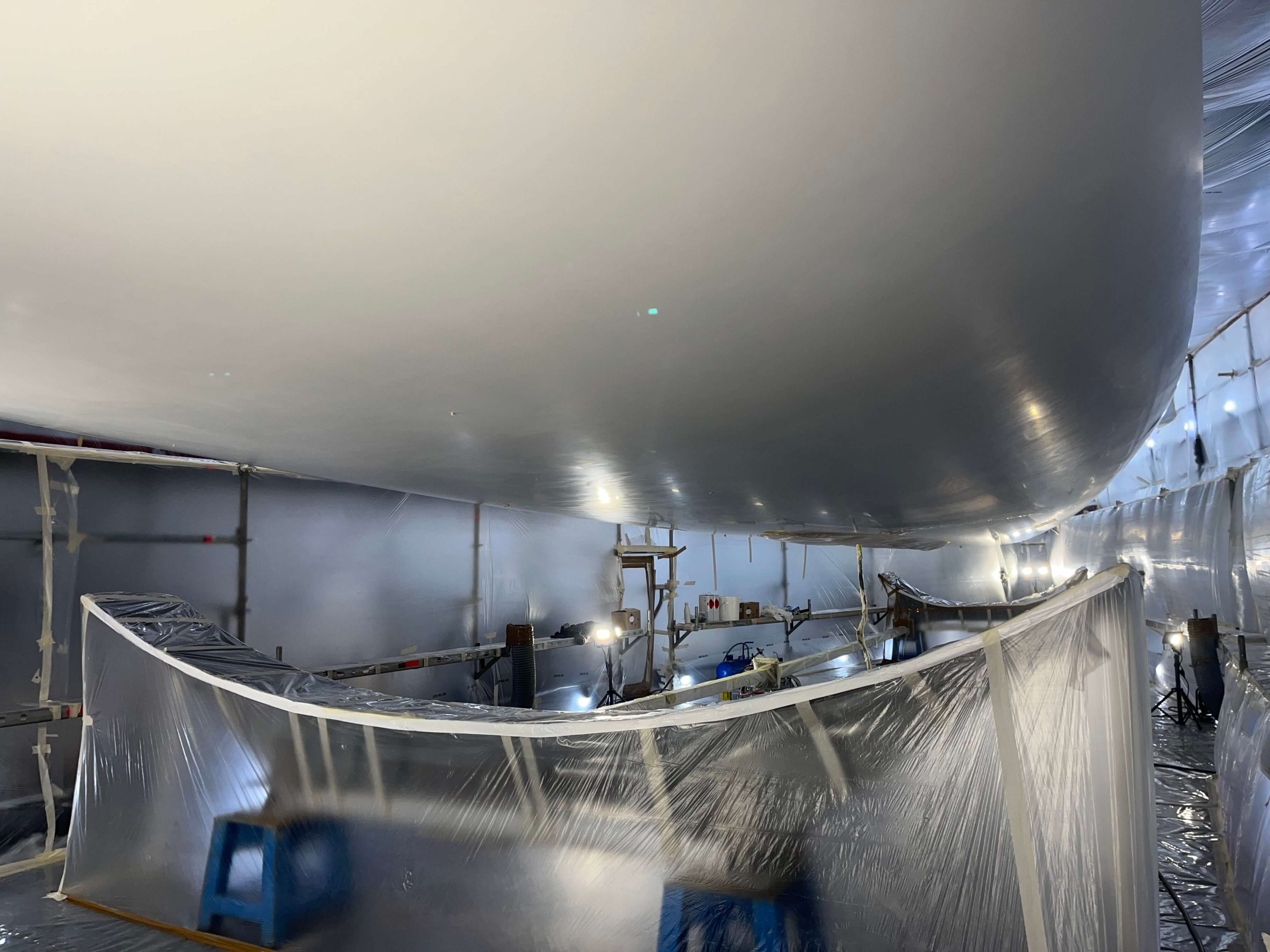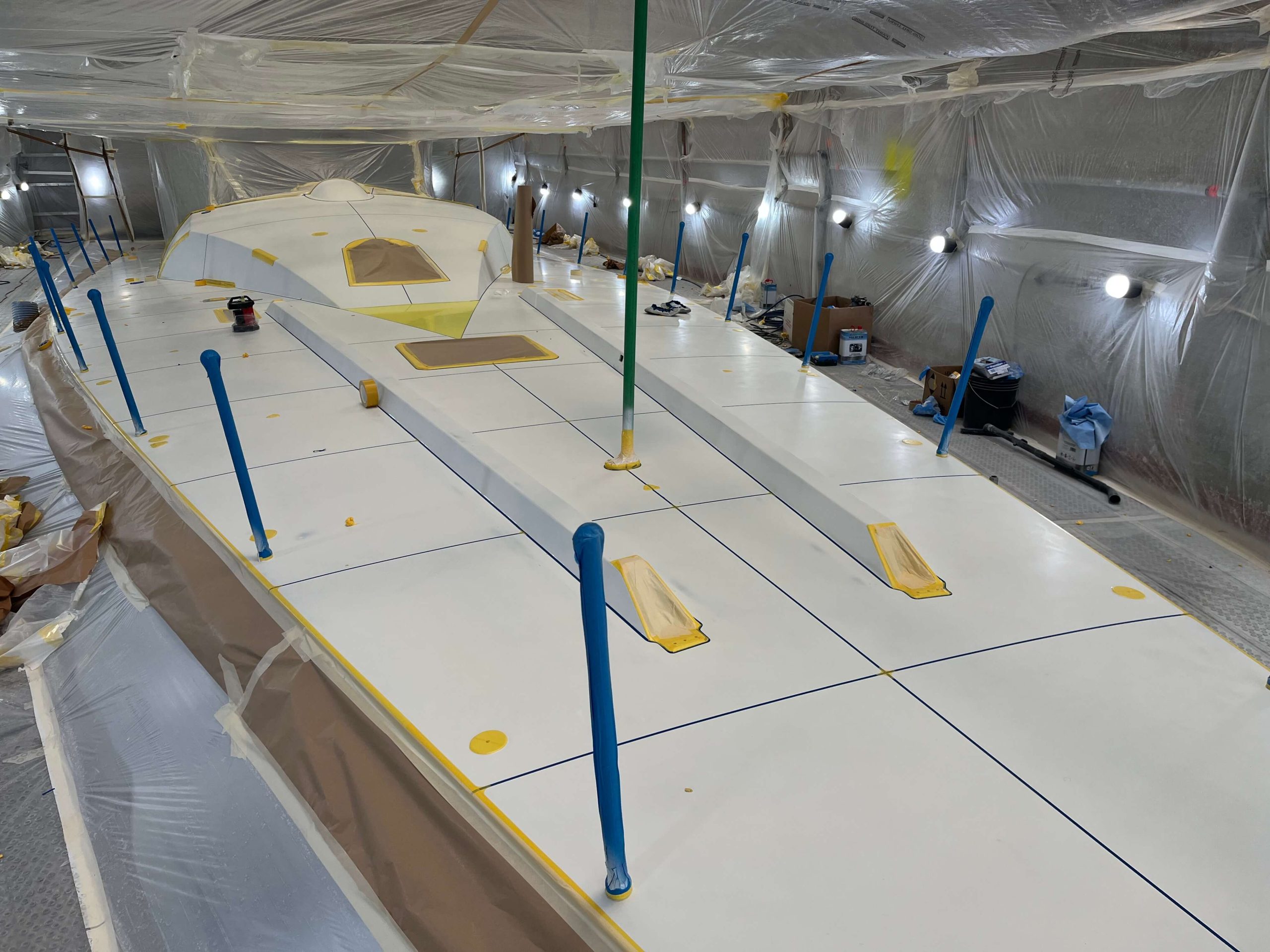 A massive refit for a VOLVO 65 racing boat, started in September 2022 at the SANGIORGIO MARINE shipyards. After removing the old films and graphics, a thorough restoration of the entire vessel was carried out, stripping it down to bare carbon before reapplying the entire AwlGrip painting cycle with matte base and lacquer finishes. A long and meticulous refit aimed at reducing the weight of the materials used without sacrificing the aesthetic aspect.