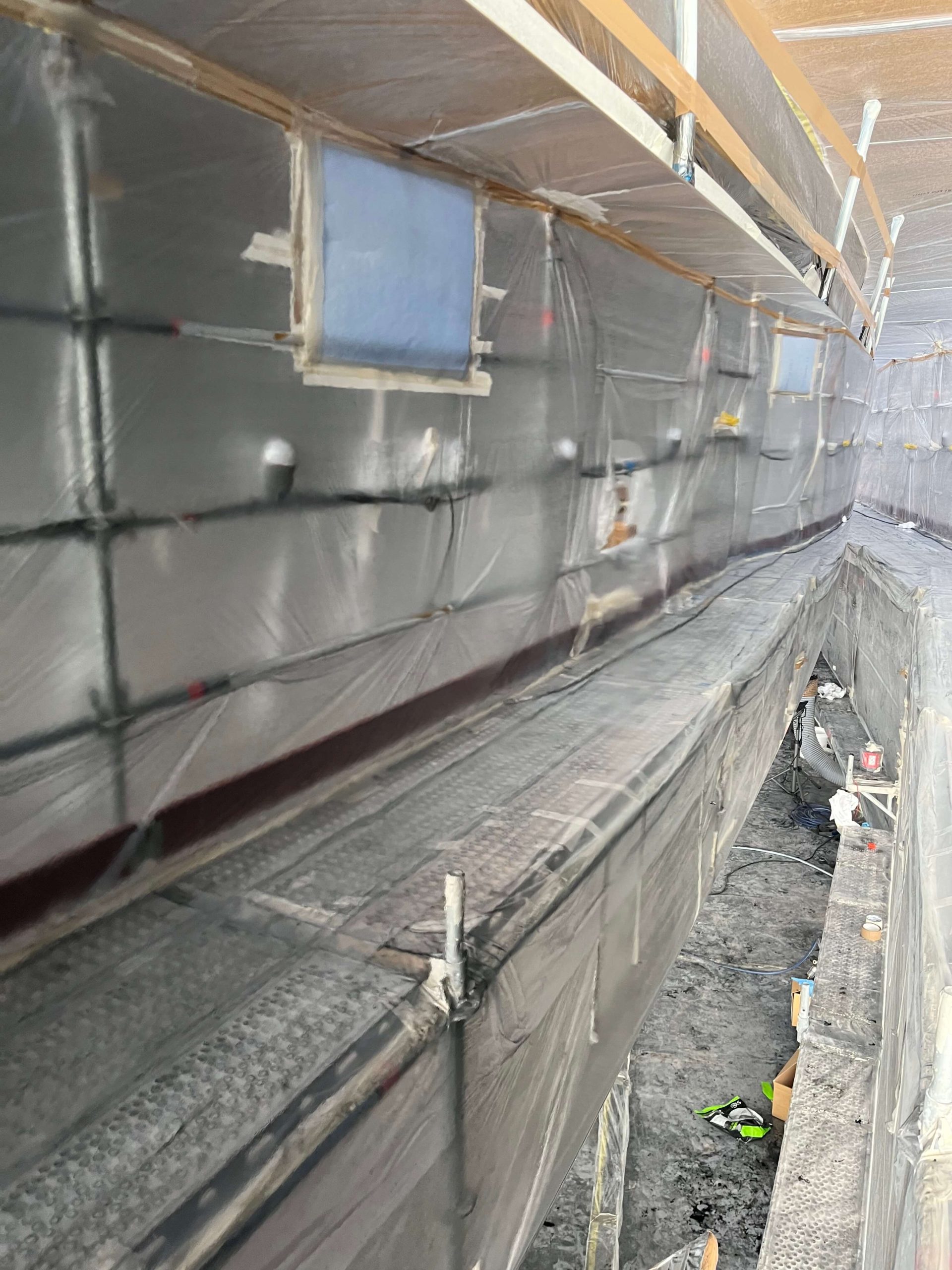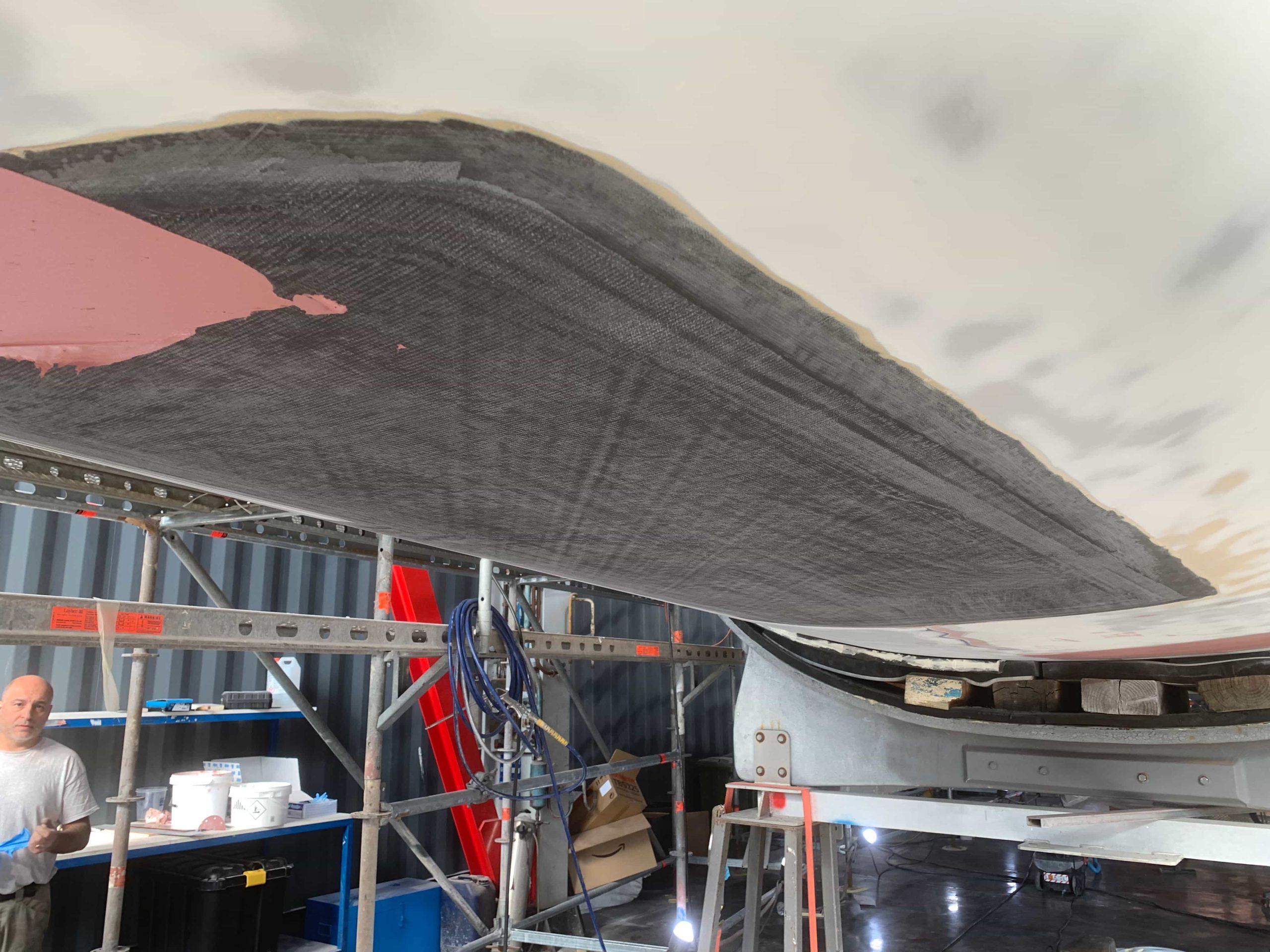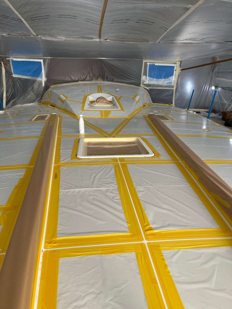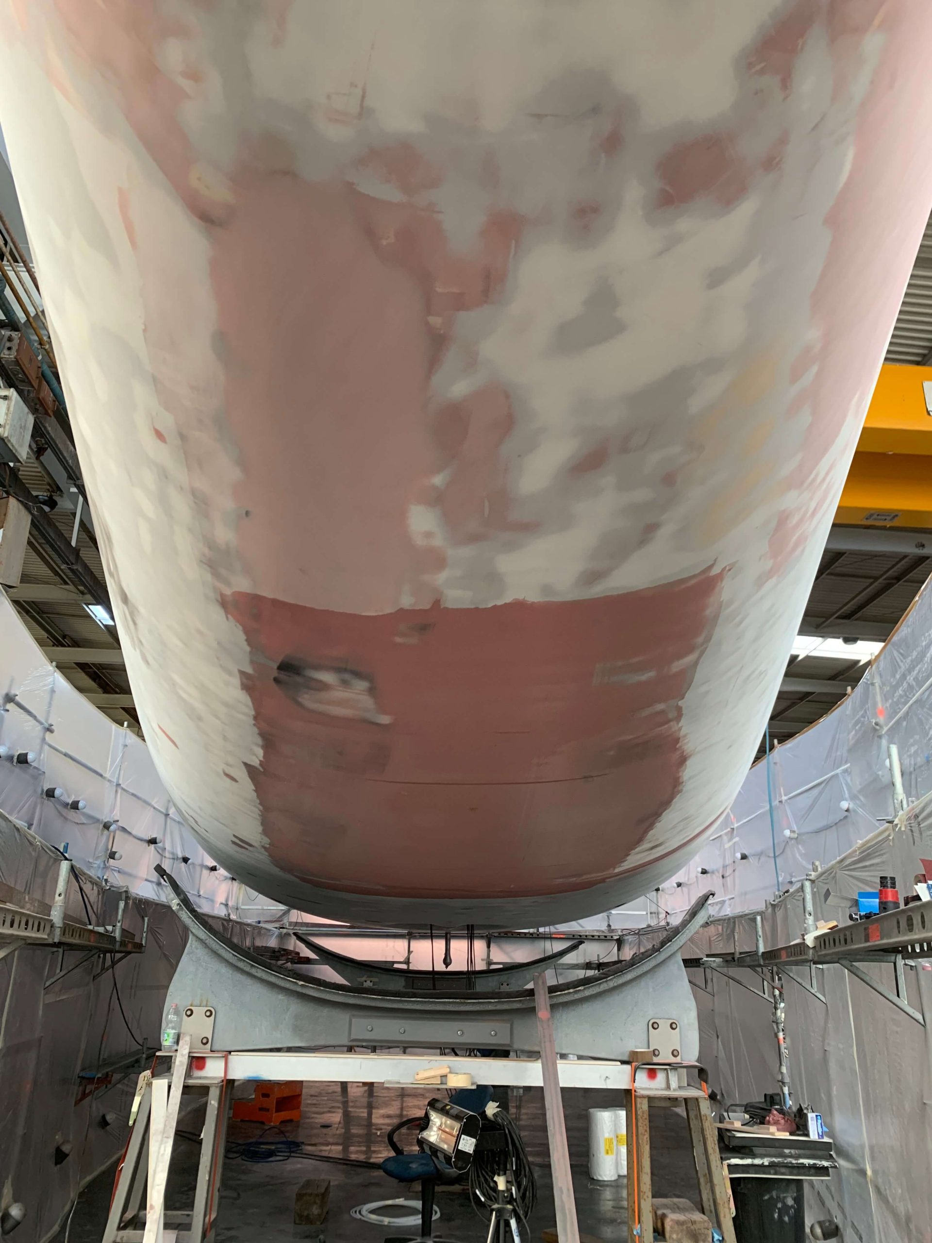 A massive refit for a VOLVO 65 racing boat, started in September 2022 at the SANGIORGIO MARINE shipyards. After removing the old films and graphics, a thorough restoration of the entire vessel was carried out, stripping it down to bare carbon before reapplying the entire AwlGrip painting cycle with matte base and lacquer finishes. A long and meticulous refit aimed at reducing the weight of the materials used without sacrificing the aesthetic aspect.